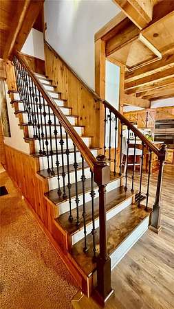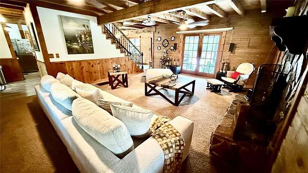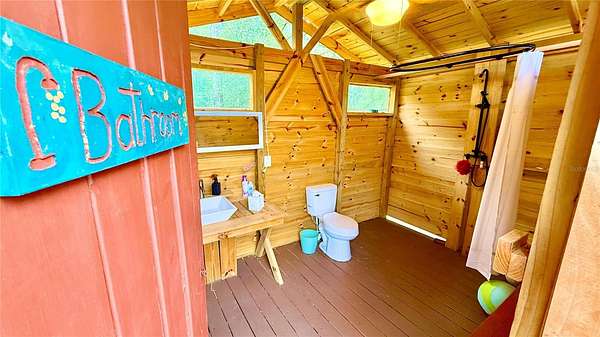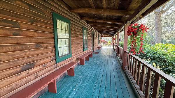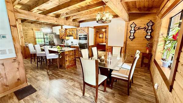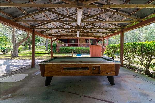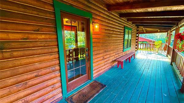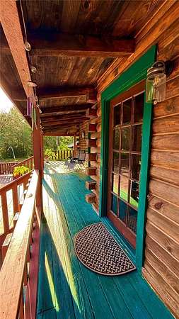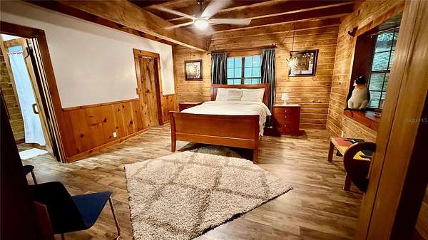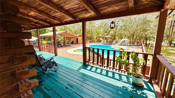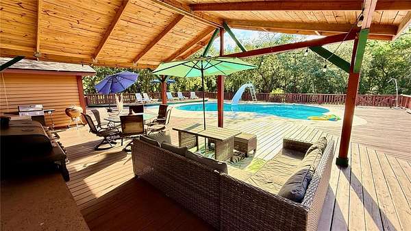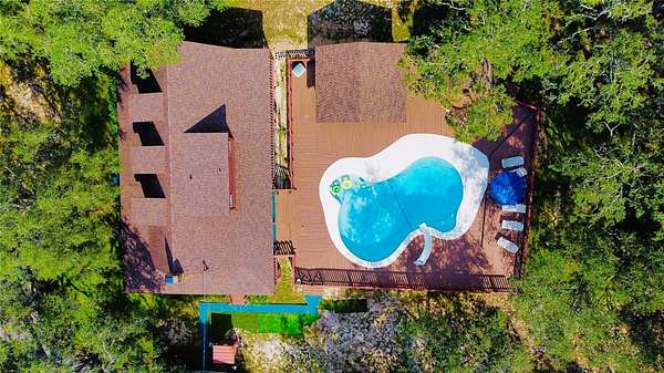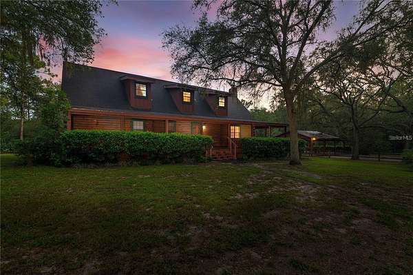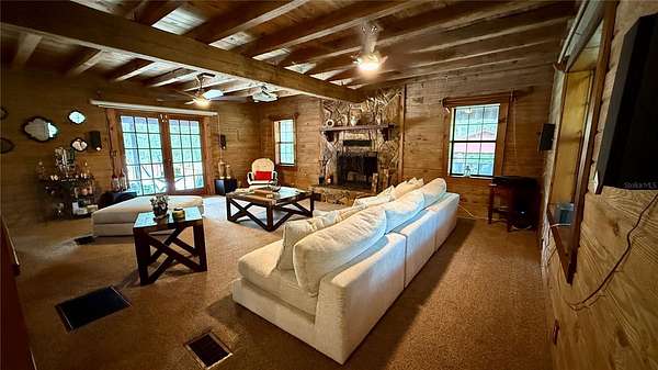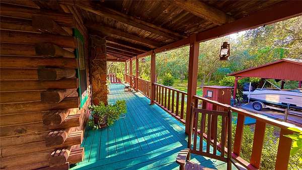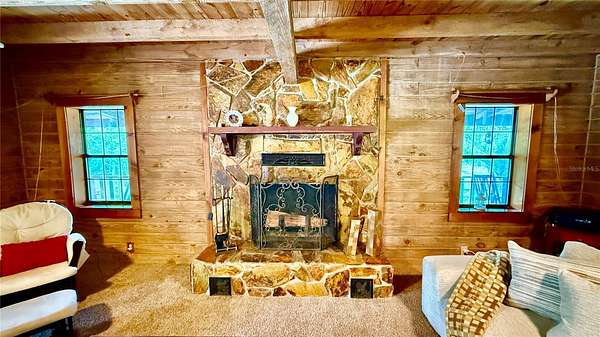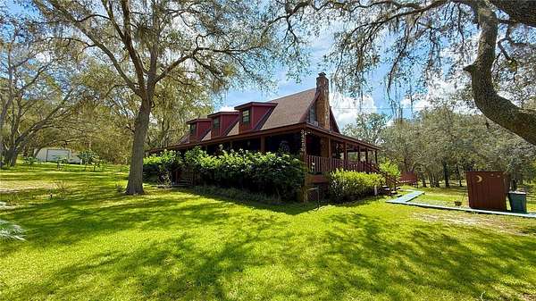 Nestled on 3.5 acres of secluded, lush Florida landscape, this PREMIUM handcrafted 2,288 sqft LOG CABIN recently updated at 34256 Belt Dr is a true wilderness sanctuary that combines luxury and nature at its best! From the moment you arrive, the authentic charm is undeniable, featuring a classic A STYLE ROOF cabin view and a sprawling front porch perfect for serene morning coffees. Inside, the home is a masterpiece of rustic elegance, centered by a magnificent floor-to-ceiling stone wood-burning fireplace in the great room, where soaring vaulted ceilings with exposed beams create an airy, grand atmosphere. The open-concept layout flows into a spacious kitchen, ideal for gathering, while the main-level primary suite offers convenient privacy. An expansive upper floor provides 3 spacious bedrooms with tons of closet space and oversize Jack n" Jill bathroom. The unparalleled uniqueness of this retreat is crowned by a massive outdoor area highlighting a deep swimming pool surrounded by a freshly done wood deck , gazebo and exterior full bath to host all your holiday events! Also, the 40'x60' (2,400 sq ft) metal 3 car carpot--a dream for hobbies, projects, or endless boat, RV , 4 wheelers storage. This one-of-a-kind property combines move-in-ready cabin charm with incredible potential as a retreat or even vacational rentals, offering a rare blend of ultimate privacy and timeless craftsmanship on a quiet country road all Zoned AR (Agricultural/Residential) -- meaning you get rural flexibility without going full backwoods. there are several great nature spots and outdoor entertainment options within a short drive. Withlacoochee River Park, The Hardy Trail is a shaded, Green Swamp Wilderness Preserve. For family-friendly fun, Crews Lake Wilderness Park and MIRADA lagoon enhanced outdoor recreation and relaxation options in the region, Your private escape awaits, do not wait to be the center of your friend's ovations and envy !