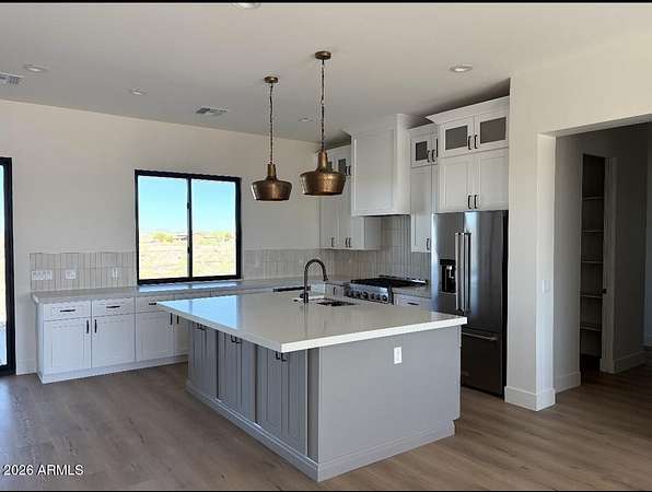 Seller Financing Available. Beautiful custom home on 4+ acres of horse property. Open concept floor plan with large chef's kitchen, walk-in pantry, and laundry room with sink. Main house consists of 3 en-suite bedrooms with an additional flex bedroom/office. Primary bedroom has dual vanity sinks with massive walk-in closet and oversized shower. Attached casita, accessible through the main house or separate exterior door. Casita has private kitchenette, full bathroom and walk-in closet. Giant 4-car garage with enough room for all your toys. Horse arena will be roughed in with option for homeowner to purchase complete package. Don't miss this opportunity for the perfect home in Wickenburg.