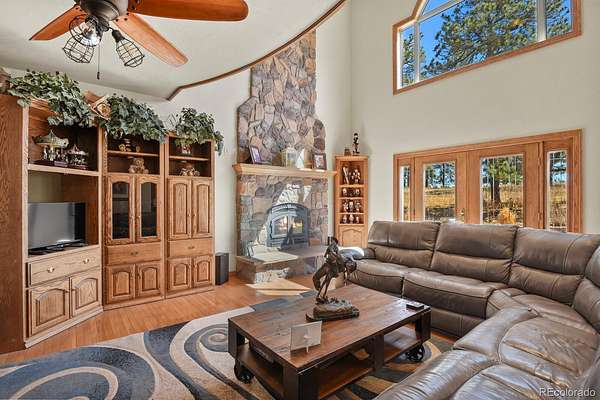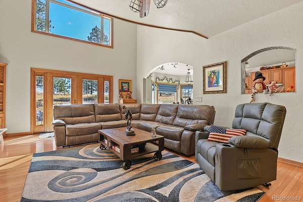Country living at it's best. This exquisite 5 BR 4 BA dream home sits on 65 acres. The setting is magnificent w/ towering pines surrounding the home. The front of the house boast a partial wraparound composite deck w/ vinyl railing. The front door opens into a 2 story foyer w/ impressive double staircase w/ designer metal balusters. Journey into the large open family room w/ two story stone fireplace perfect for entertaining. The large kitchen is a chefs dream w/ stainless steal appliances, granite counters, porcelain tiles, maple cabinets, walk in pantry, & breakfast nook. For formal dinners a separate, formal dining room with coffered ceilings. The main floor also boasts living room, bedroom w/ custom built in shelving (perfect for an office), & full bath. Travel upstairs to the Primary Suite with coffered ceilings, private sitting room, fireplace, & kitchenette, also a large 5 piece bath & walk in closet. There is a second primary bedroom w/ ensuite bathroom, as well as 2 additional bedrooms, 4 piece bath & loft that overlooks family room. The walkout basement is unfinished but was designed for 2 additional bedrooms, living room, 2 bathrooms & sauna just waiting to be completed. This incredible home was custom designed w/ no expense spared w/ wood finishing throughout, radiant floor heating, & has been pristinely cared for. Exit the back of the house thru the family room French Doors onto the stamped concrete patio perfect for family gatherings. There is a sprinkler system for the front & back & drip system for flower beds. The 40x60 work shop has electric and concrete floor perfect for storing tractors, RV's, cars, or any other toys. Property is fenced & perfect for grazing. Zoned agricultural & currently has a tax ag status to keep taxes low. Water rights & mineral rights have not been filed but are available. This beautiful one of a kind home won’t last long. W/ full priced offer Ford Model 2120 tractor & attachments are included. New roof & gutters on house.