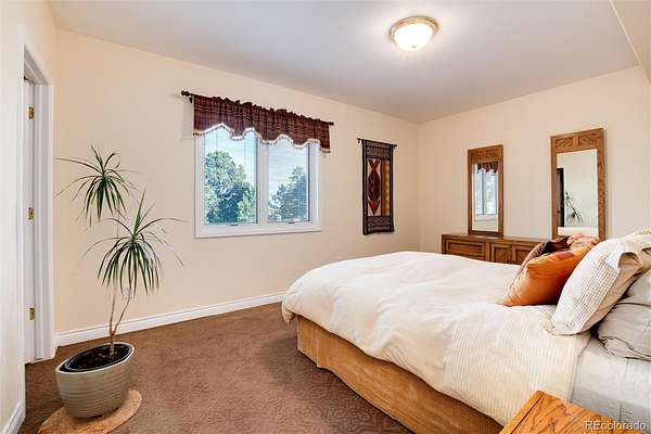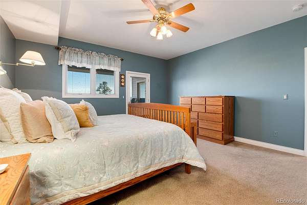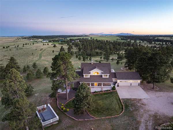 Rural living at its best: 62 acres of rolling terrain with abundant native trees, open meadows, gorgeous mountain views and almost 5000 finished square feet. Secluded yet only 5 miles to Kiowa. Custom two-story built in 2000 . Full walkout basement. Situated to give views of Pikes Peaks and Mt Evans framed by trees. Open concept living. Expansive volume ceilings. Abundant windows give natural light. Great Room with two-story rock fireplace. Kitchen open to Great Room. Solid surface counters. Tons of storage. Primary Suite on the main floor with large deck. 5-piece bath with jetted tub. Walk in shower. Plenty of closet space. Hardwood floors on main level (except Primary). Three bedrooms + office and full bath upstairs. Walkout basement is almost 2100 square feet with huge rec room, kitchen + breakfast nook and two bedrooms with full bath. Attached 3-car garage + nearby 32’ by 48’ heated outbuilding for vehicles/equipment. It has a finished "flex" space - use as a man cave, workout room or whatever else you desire. A 1200-square foot garden area with greenhouse. Fruit trees-fenced to keep deer out. Relax in hot tub. Stay fit in 14’ long all-season swim spa. A 10-kW solar system + a geothermal power source means lower utility bills. 7,200 acre-feet of adjudicated ground water rights. Ag zoning keeps property tax low. Fiber optic available. Superbly maintained–new roofing, gutters, garage doors, full exterior painting, Pella triple-pane, all within last 3 years. Move-in ready + priced right to provide instant equity if you want to do kitchen, bath and other updates down the road. Photos of three virtually staged and remodeled rooms included to give just one example of what an updated interior might look like. Info from sources deemed reliable but not guaranteed; provided without intention that buyer rely upon it. All info to be verified by buyer independently.