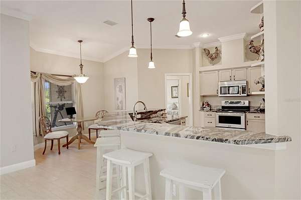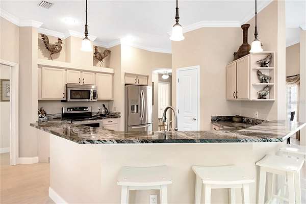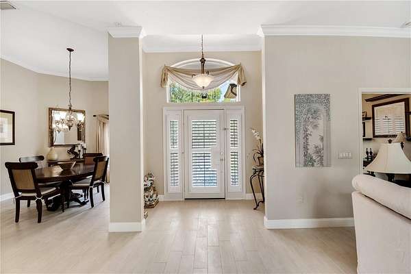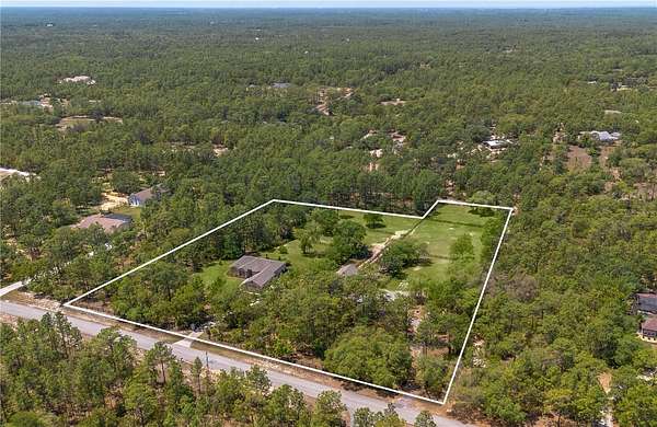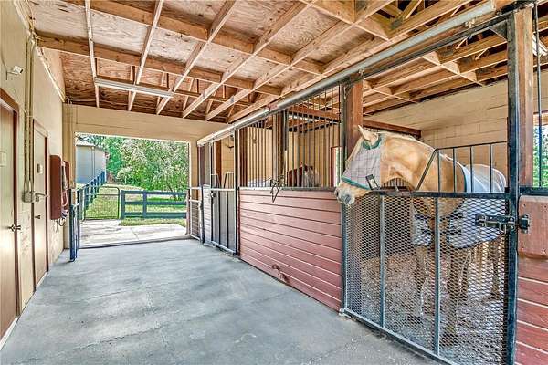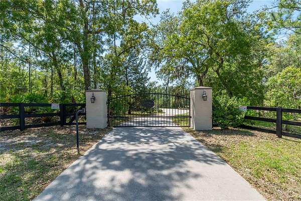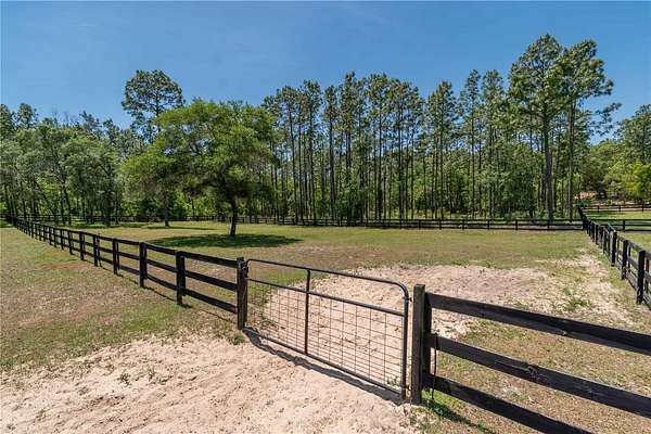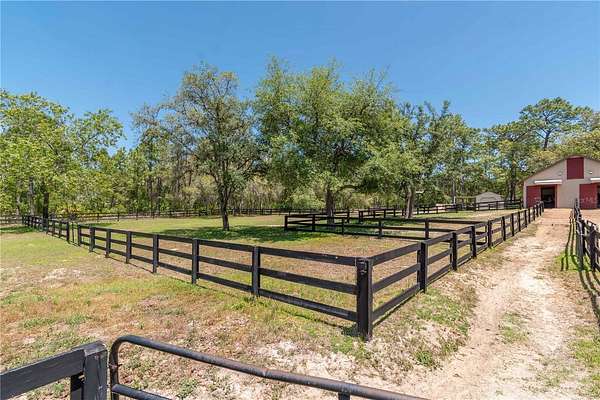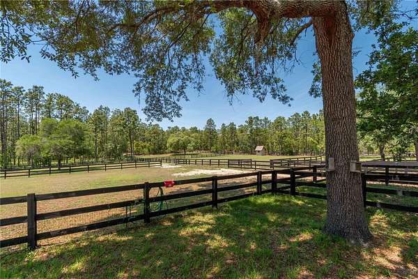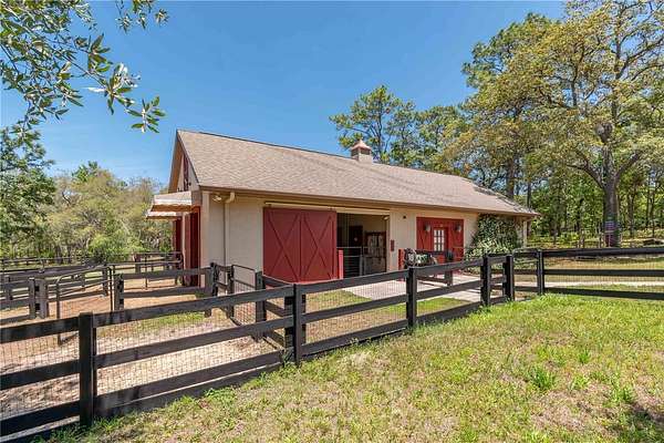 Discover a rare blend of refined living and outdoor beauty, tucked within the desirable Pine Ridge Equestrian Estates community of Beverly Hills. Set back from the road on 5.54 acres, this inviting property is framed by mature trees that provide privacy and gentle shade, creating a peaceful, welcoming environment. The 3-bedroom, 2-bath home offers a spacious open floor plan, complete with high ceilings, crown molding, and elegant detail-oriented finishes. Light and bright, the home features abundant natural light from large windows, skylights in the living room, and sliding glass doors out to the rear patio. At the heart of the home is the thoughtfully designed kitchen, which features granite countertops, stainless steel appliances, a large breakfast bar, and pantry. Enjoy casual mornings in the breakfast nook overlooking the rear porch, host gatherings in the formal dining room, or work comfortably in the dedicated home office. The primary suite serves as a true retreat, offering two walk-in closets and a luxurious en-suite bath with dual vanities, jacuzzi tub, and a large walk-in shower. Outdoor living is equally impressive, with a screen-enclosed patio featuring ceiling fans and plenty of seating space, leading to a raised wood deck surrounded by flowering jasmine. An attached three-car garage and a full security system add everyday convenience and peace of mind. Designed with equestrian enthusiasts in mind, the property features a center-aisle barn complete with 2-stalls that could be converted into a 4-stall barn, hot water, a wash rack, a feed room, a tack room/office with a half-bath. Eight fenced paddocks provide ample turnout space, while the two-story barn includes a large attic for storage or future expansion and customization. Residents of Pine Ridge enjoy access to a wealth of amenities, including 28 miles of scenic riding trails, a community clubhouse, stabling facilities, and recreational courts. Plus, the property is located just a short drive from the sparkling Gulf Coast and a growing array of shopping, dining, and entertainment options in the vibrant, developing Beverly Hills area. Ocala is just a short drive away, opening up even more opportunities to compete, train, and experience the finest equestrian venues in Central Florida. This is your opportunity to own a property where privacy, comfort, and equestrian excellence come together seamlessly!