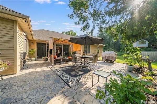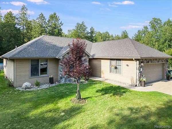 Tucked away in a secluded woodland paradise with a winding private driveway, this spacious ~2443 Sq Ft custom ranch offers a serene escape on a vast, mostly wooded lot with a tranquil pond view, blending privacy and wildlife with the convenience of being just a short drive from a major grocery store, the expressway, downtown, premier golf courses, and abundant outdoor activities. Step inside to an inviting open-concept layout, where a welcoming foyer flows into a generous living room with a large four-panel door wall showcasing an expansive stamped concrete patio and lush backyard. The home's custom oak cabinetry, woodwork, and solid oak interior doors exude timeless elegance, complemented by sleek Corian countertops, tile, and hardwood flooring. The well-appointed galley kitchen, a chef's delight, ample storage with multiple pantry cabinets, numerous drawers, and wall & base cabinets, seamlessly connecting to a sizable family room with oversized windows, a bar area, and French doors opening to the patio. The primary suite is a roomy retreat, featuring a walk-through closet with dual dressers and organizers, leading to a luxurious bath with a spacious dual shower, dual sinks, and abundant storage. Additional bedrooms offer built-in countertops, large closets, and large windows, while a full second bathroom ensures comfort. Radiant in-floor heating throughout delivers a warm, allergen-reduced embrace, enhancing the home's well-insulated, tranquil ambiance. Outside, a blacktop and gravel circle driveway reduces summer heat, paired with an attached multi-car garage with radiant heat and built-in shelving, and a detached expansive pole barn with a heated workshop, office, and versatile kennel area. With ample parking, a newer hip roof, and a convenient laundry room off the kitchen, this home offers unmatched storage, craftsmanship, and serenity, perfect for those craving a private retreat with modern conveniences and nature at their doorstep. Agent related to owner.