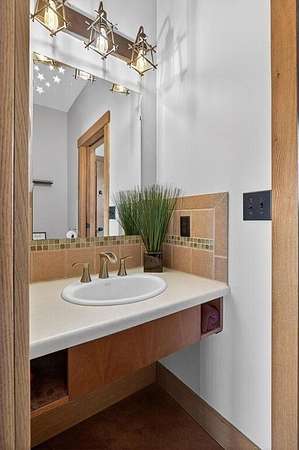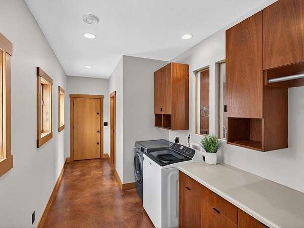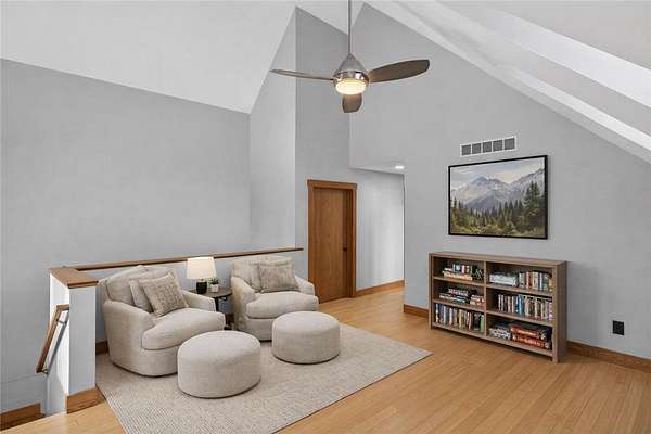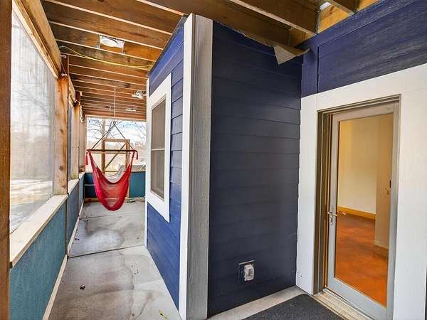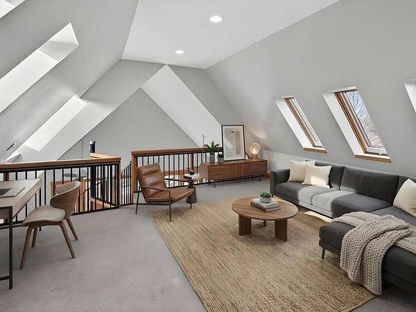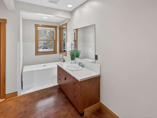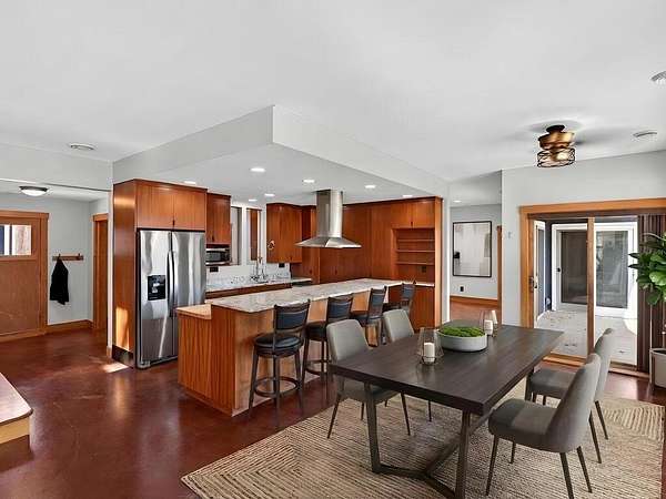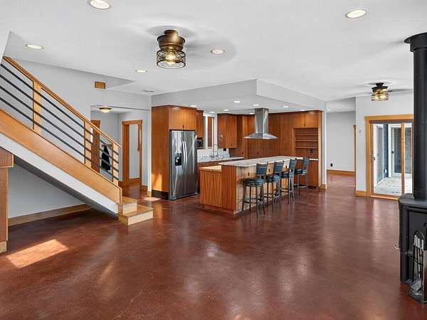 Inside, twelve skylights and expansive windows bathe the vaulted interior in natural light. A dramatic mezzanine overlook enhances the open design, while stained concrete floors with in-floor heat, solid wood mission-style finishes, bamboo flooring, and granite countertops add warmth and character. The slab-on-grade layout allows for true one-level living with a main floor primary suite, laundry, and everyday living spaces all within easy reach. Three bedrooms on one level provide sought-after flexibility.