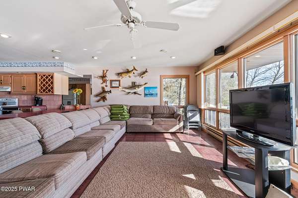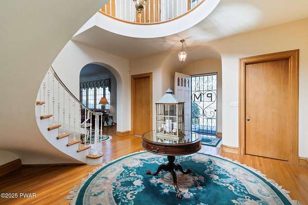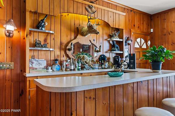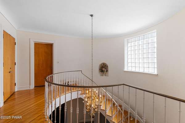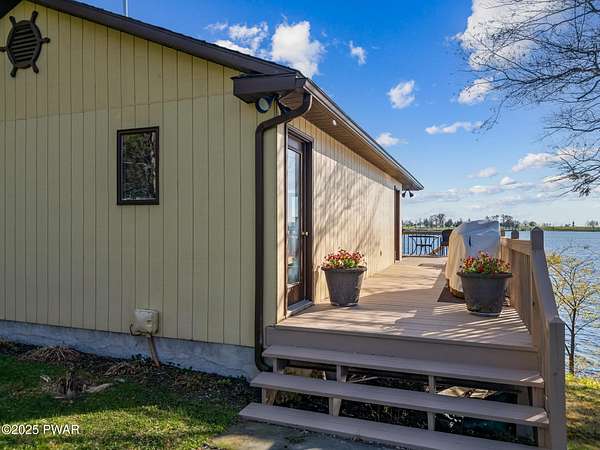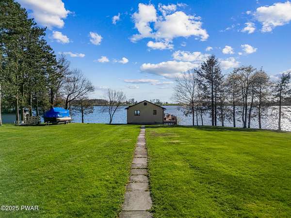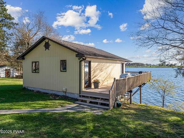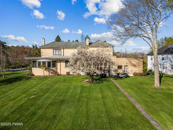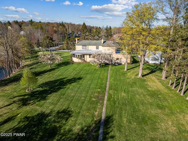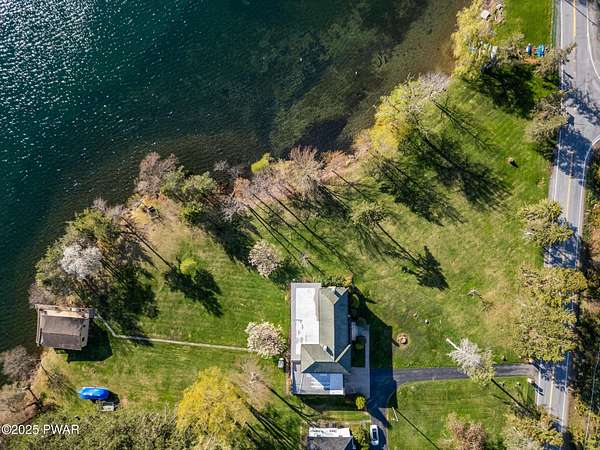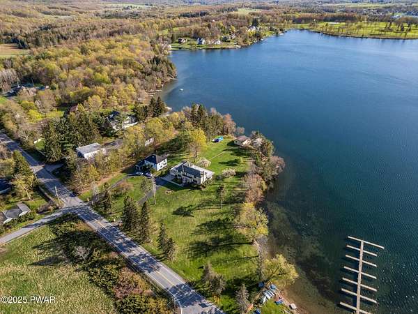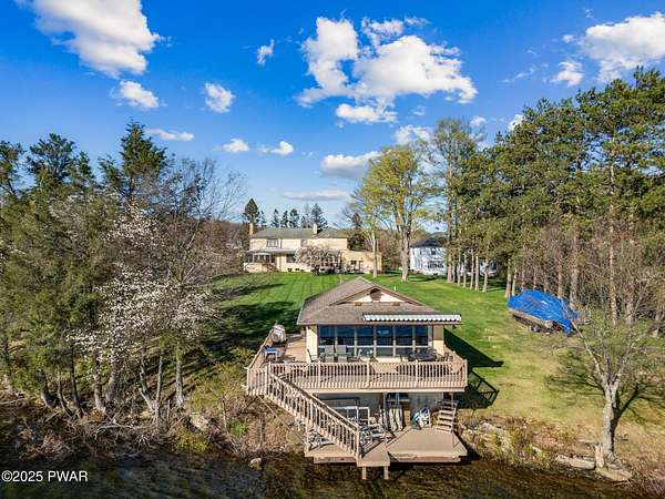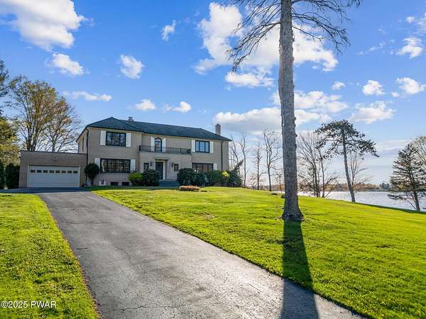 PUBLIC AUCTION - Sunday NOV 2nd - 1 pm. Open house tours start at 11 am day of auction. Call listing agent to register.John Regan Auctions for more information.Available for the first time in over 55 years, this lakefront estate offers an extraordinary combination of privacy and natural beauty. 3.4 deeded acres with over 550 feet of shoreline on the pristine, spring-fed waters of Crystal Lake, the east side of the lake enjoys panoramic sunset views and Elkview Country Club across the water.The main residence offers 4,018 sq ft of living space, including 3 bedrooms and 3.5 bathrooms. Built in 1952, the home blends Neoclassical Revival architecture with Mediterranean flair, featuring a white brick exterior, concrete tile roof, and a grand ironwork front door. A sweeping circular staircase with brass railing serves as a central design element, surrounded by hardwood floors, high ceilings, and a circular family room with expansive lake views. The living room is anchored by a white Italian marble fireplace, with matching marble window sills throughout.An inviting bar and entertaining room pays homage to the owners' love of the outdoors with pine paneling and local wildlife decor. The screened porch opens to a bluestone sidewalk that leads to the boathouse.The estate is approached via a stately 150-foot driveway flanked by two masonry pillars. Elevated slightly above both the road and the lake, the home enjoys enhanced privacy and sweeping views.A separate 672 sq ft boathouse, built in 1989, includes a full kitchen, bath, open-concept living and dining area, and a 275 sq ft deck overlooking the lake.Crystal Lake is a private, glacial, spring-fed lake covering approximately 180-190 acres with depths reaching up to 86 feet. The lake permits both motorboats and personal watercraft. The property is just 2.5 hours from New York City and Philadelphia, and only 9 miles from Elk Mountain Ski Resort, making it a rare year-round retreat.