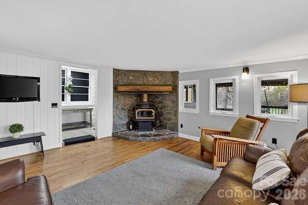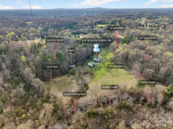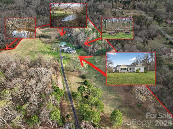 Welcome to this truly one-of-a-kind country retreat featuring 17.54 acres of beautiful land, complete with a wide, scenic creek and abundant wildlife. This unique property offers the perfect blend of charm, functionality, and natural beauty, including a pond, barn, and multiple farm-style outbuildings such as a classic spring house, wood shed, and covered walkway. A long private driveway leads you to a charming beautiful home filled with warmth and character. Primary bathroom has a tile shower. The inviting family room is bathed in natural light from numerous windows and features a cozy standalone fireplace, creating the perfect gathering space. Step outside to a stunning covered back or front porch where you can relax on the porch and take in the breathtaking, expansive views of your land. Whether you're enjoying quiet mornings or peaceful evenings, this setting is truly special. Additional features include a multi-car detached carport connected to a versatile multi-use garage, ideal for hobbies, storage, or workspace. With ample farmland and a beautiful creek bordering part of the property, this is a rare opportunity to own a unique piece of countryside paradise. Must see to fully appreciate-don't miss this exceptional opportunity!