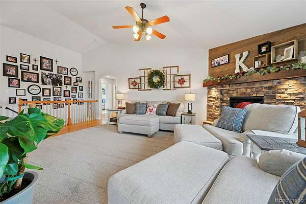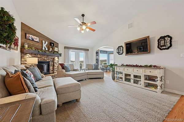 Well maintained and perched atop a hill with sweeping 360° views. Noticeable care and thoughtful updates show pride of ownership. Ultra clean home is stucco on the exterior, warm interior offers an open, light-filled floor plan with oak hardwood floors, dedicated office, designer lighting, and a gas fireplace with stone surround. Well-appointed kitchen with one-year-old Whirlpool appliances, bay-window breakfast nook with walk-out, main-level laundry, and bonus sitting area with views. Spacious primary suite features coffered shiplap ceiling, walk-in closet, and five-piece bath. Walk-out basement includes large rec room, three additional bedrooms, full bath, and access to patio with built-in propane grill. Three-car garage and central AC. Expansive partially covered deck. Hot tub, grill, fire pit, and chicken coop with chickens included.