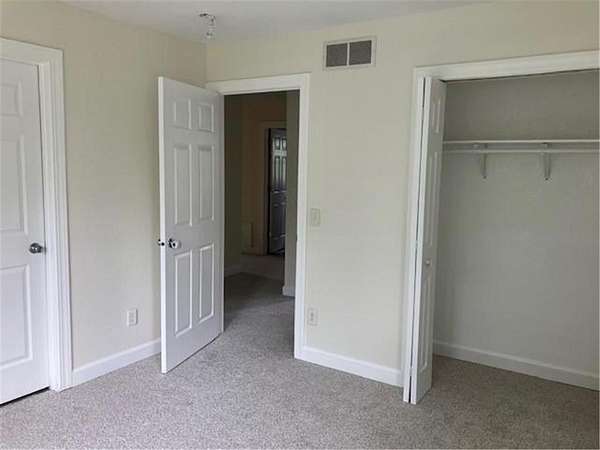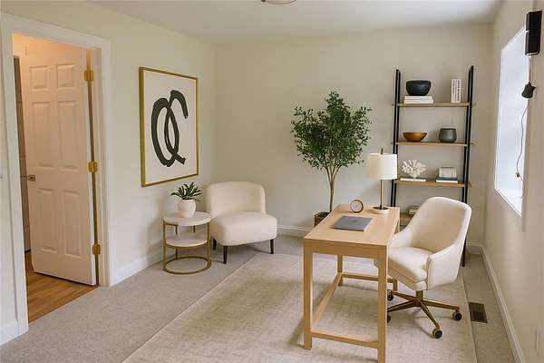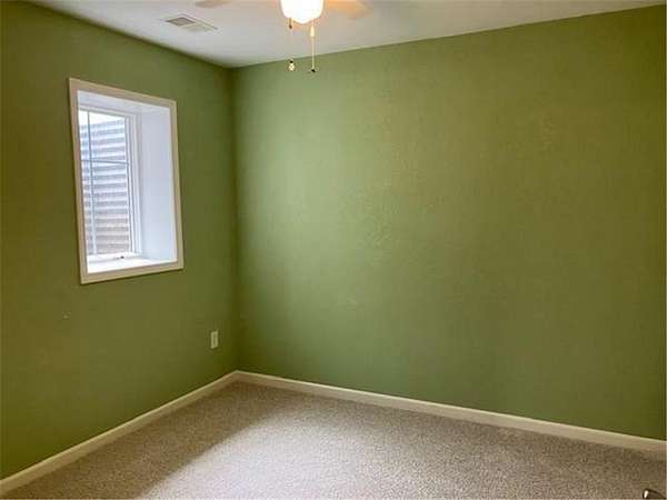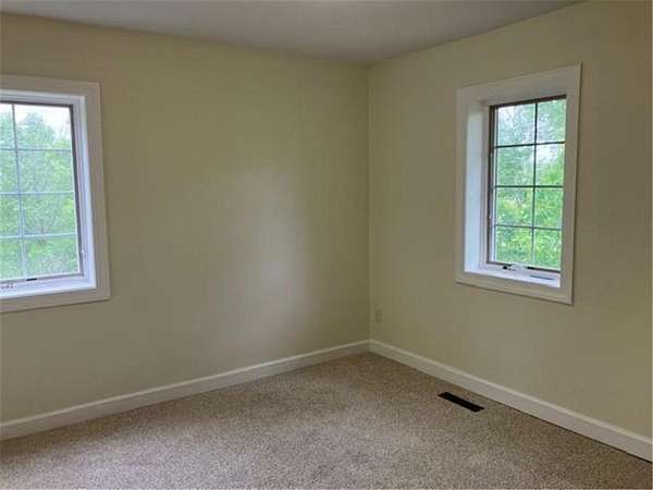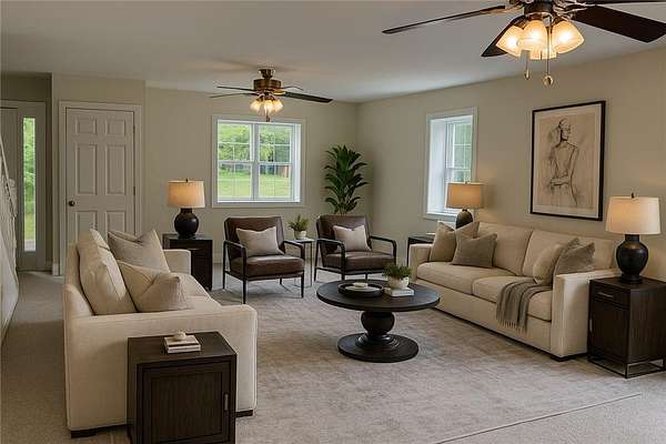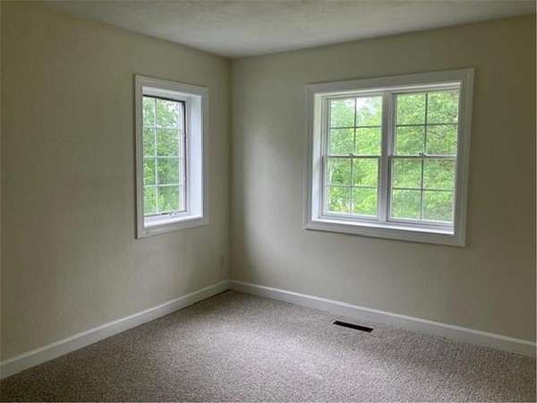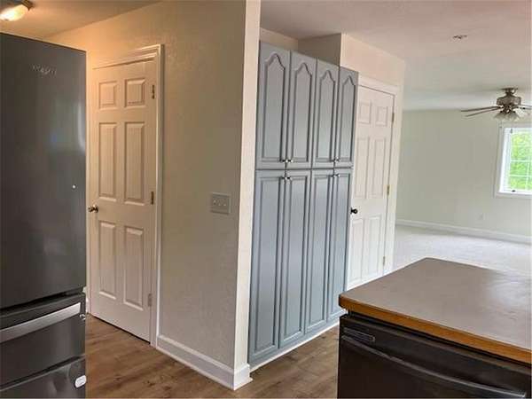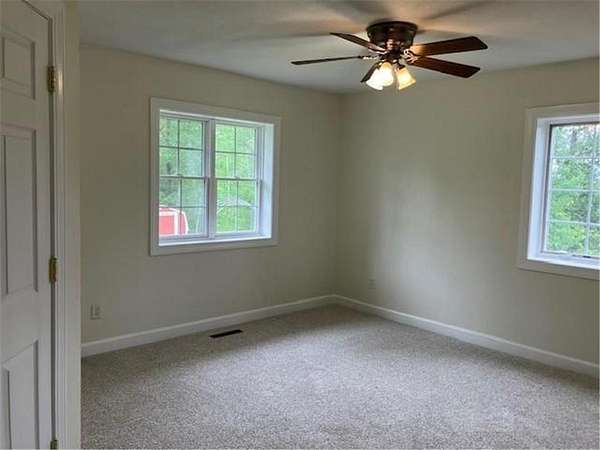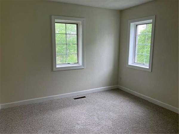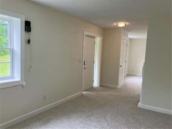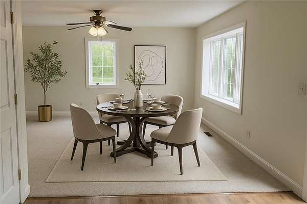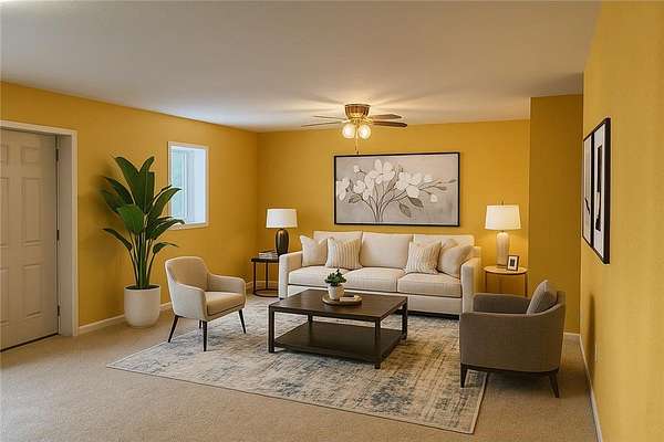 New light-colored laminate flooring, fresh carpeting in bedrooms, hallways, dining room, stairs, eggshell white walls, textured ceilings.