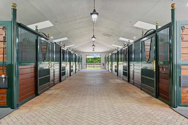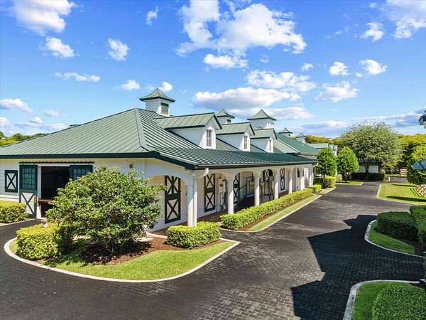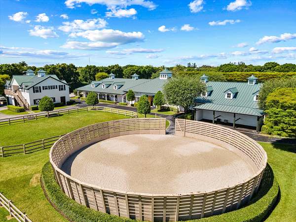 This top-tier equestrian estate located in Wellington's Grand Prix Village, features 24 stalls with water access, 4 grooming stalls, 6 large grass paddocks, and a 150x270 Martin Collins arena. Additional highlights include an 8x32 round pen, 3-bay covered wash rack, spacious viewing porch and gazebo. The center aisle barn offers a tack room with full bath, feed room, and ample storage. Owner's lounge features a full kitchen, office, and bathroom. A separate storage building houses equipment and laundry facilities. 2 apartments upstairs feature 3 bedrooms and 3 full bathrooms. With full security, Generac generator, and gated entrances, this farm is move-in ready for serious equestrians.