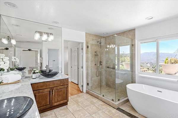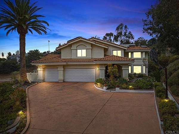 Introducing a stunning residence nestled in the vibrant city of Escondido, providing the perfect blend of comfort, style, and convenience. This exceptional property boasts five bedrooms, including a spacious primary bedroom with an additional room to be used as an office or extra walk in closet, and four well-appointed bathrooms. Encompassing an impressive interior square footage of 3,764sqft, the house offers ample space for both living and entertaining. A unique feature of this home are the breathtaking views of the hills of Lake Hodges from most rooms, specifically the office and sun room. Enjoy your morning coffee from the sun room or your office while looking out onto the natural beauty that is Lake Hodges. Privacy is one of this homes incredible features as the home is nestled down on a private road and two of the bedrooms are able to be partitioned off as private living space with their own bathroom for guests or additional family. The backyard and expansive lot promises endless opportunities for outdoor activities and gardening, allowing a personal oasis for relaxation or lively gatherings. The location is exemplary, sitting comfortably close to the serene Lake Hodges, essential freeways, and the bustling shopping hub, ensuring all your needs are just a stone's throw away. For those who appreciate nature's touch, the proximity to Felicita Park provides a perfect backdrop for morning jogs or leisurely evening strolls. Whether hosting guests or enjoying a quiet family day, this home delivers an environment that's both welcoming and luxurious.