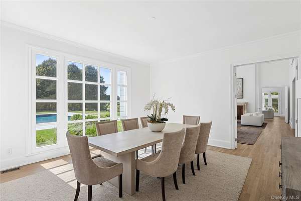 Tucked within the prestigious Estate Section of Southampton Village, south of the highway and set on 1.9 private acres with 120+/- feet of waterfront along Taylor Creek, 344 Great Plains Road unfolds like a modern Hamptons classic-quietly grand, elegantly remodeled, and perfectly composed for luxurious indoor-outdoor living. From the moment you enter the sweeping private driveway and step through the front door, the home tells a story of timeless architecture married with a complete top-to-bottom renovation that honors both sophistication and ease. The double-height entry hall sets the tone, flooded with natural light that pours in from every direction thanks to a thoughtfully opened and cleared landscape. Sightlines extend through the great room's towering ceilings and over a dozen French doors that lead to stone patios, expansive lawns, and serene water views. Throughout this 5,000+/- square-foot residence, matte-finished hardwood floors, custom millwork, and refined lighting create a warm, modern elegance that feels both curated and inviting. At the heart of the home, the brand-new chef's kitchen blends clean design with professional-grade functionality. Marble countertops sweep across crisp custom cabinetry, framing a full suite of premium appliances, including a Wolf range, dual dishwashers, convection and microwave ovens, a Sub-Zero refrigerator/freezer, and under-counter beverage coolers. A breakfast area surrounded by glass opens to the gardens, completing a space tailor-made for gatherings both casual and elevated. The home's layout is thoughtfully considered, offering both a sense of flow and privacy. A guest suite on the first floor, situated adjacent to the den/family room, is ideal for company or multigenerational living. A convertible office with its own full bath in the kitchen wing provides flexible space for work, play, or additional sleeping arrangements. Up the gracious staircase, the primary suite becomes a private retreat-featuring its own fireplace, sun-filled private deck, and an exquisitely renovated bath with dual vanities, rain-head shower, soaking tub, separate W/C, and a beautifully appointed dressing room with custom walk-in closets. Two additional guest suites complete the second level, each opening to a shared terrace overlooking the rolling lawn, shimmering pool, and Taylor Creek beyond. Outside, the property is a sanctuary unto itself. Wide lawns stretch toward the water, bordered by mature trees and lush, meticulously refreshed landscaping. The newly enhanced pool features an in-pool spa. It is anchored by a fully renovated pool house, offering a sitting area, changing room, separate shower, and WC-perfectly designed for days spent on the terrace or evenings entertaining at sunset. Additional amenities include two one-car garages, a spacious parking court, and complete privacy throughout the day as the sun moves across the property, reflecting off the water and grounds in a way that makes this home feel worlds away-yet it remains just moments from Southampton Village, world-class beaches, and everything that makes the Hamptons extraordinary. 344 Great Plains Road is more than a home-it is a rare south-of-the-highway estate offering quiet luxury, water views, and a lifestyle defined by beauty, comfort, and timeless Hamptons living.