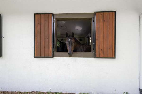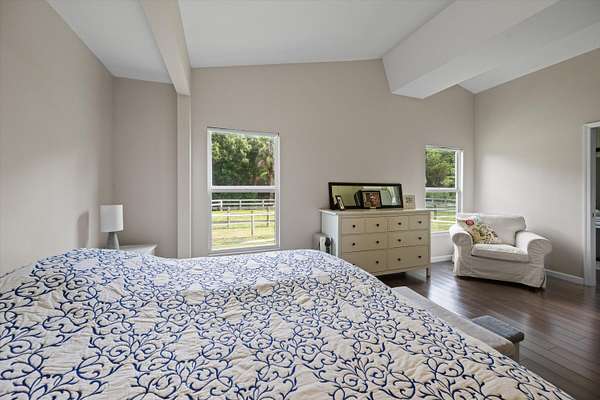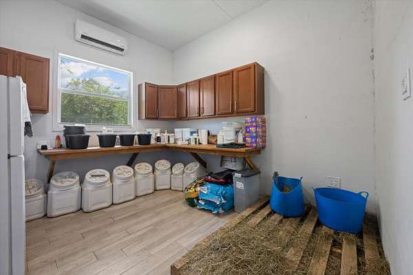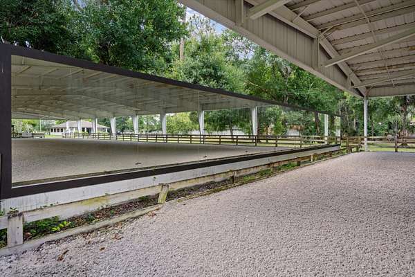 COVERED ARENA with concrete mirror wall, excellent footing and lights!!! This beautiful 5-acre property is perfectly set up for a dressage farm. The center aisle cbs barn has 8 stalls, a spacious feed room, large tack room and laundry room / bathroom. There are roll-up doors and shutters for hurricane safety. Each stall has fans and is hooked up to the fly spray system. 8 irrigated paddocks with shade trees and three-board fencing offer plenty of turn-out. A Four-Horse Walker is conveniently located close to the barn. The 2 bed /2-bath home is built of solid concrete... including the roof! All windows and sliders are impact glass. This home is built rock solid for hurricane resistance and energy-efficiency. The large, covered patio looks out to the arena.