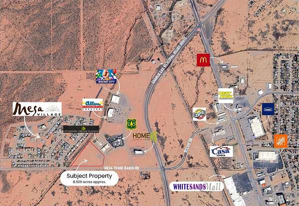 Unlock exceptional development potential with this 8.929-acre commercial parcel located in the thriving Mesa Village district of Alamogordo. Boasting dual frontage along Mesa Verde Ranch Rd. and Las Palomas Rd., this property offers unparalleled visibility and accessibility in one of the city's most dynamic commercial corridors. Key Features: Strategic Location: Situated near prominent establishments such as Allen Theaters, Rocket City Family Fun Center, Home2 Suites by Hilton, and the US Forest Service headquarters. The forthcoming Otero County Courthouse is also nearby, enhancing the area's significance. Zoning: Designated as C-3 Business District, allowing for a diverse range of developments including retail centers, office complexes, hospitality ventures, and mixed-use projects. Infrastructure: Utilities such as city water, sewer, natural gas, and electricity are readily available at the property line, streamlining the development process. Proximity to Major Employers: Close to Holloman Air Force Base and White Sands Missile Range, providing a steady influx of potential customers and clients.