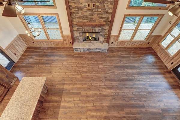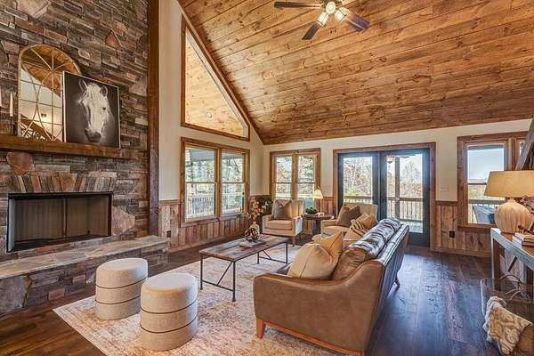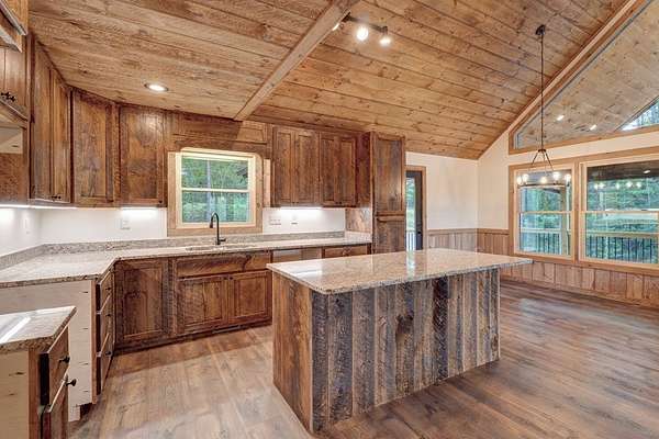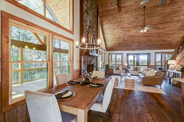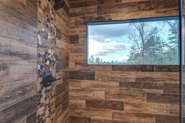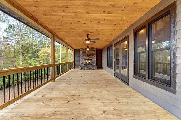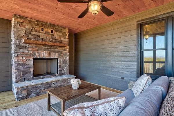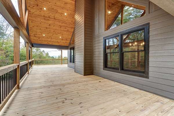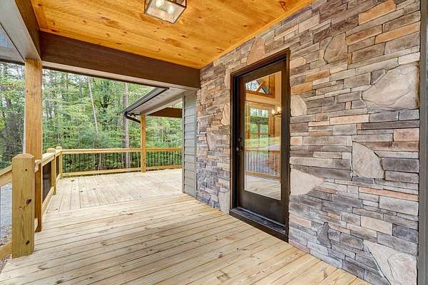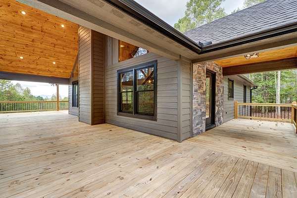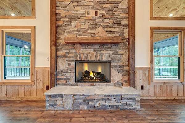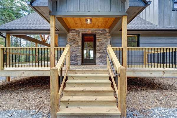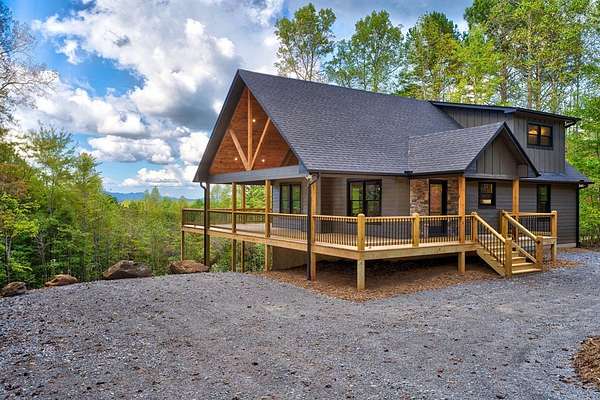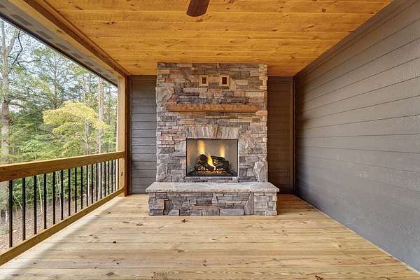 This traditional craftsman new construction with a long-range mountain view is nestled on a quiet, paved road with level terrain located 15 minutes from downtown Blue Ridge. This 4-bedroom, 4-bathroom is built in the traditional Craftsman style, every detail reflects quality craftsmanship and thoughtful design. There is a spacious, open-concept layout with premium finishes throughout, including granite countertops, elegant fixtures, and rich wood accent walls as well as circle sewn wood ceilings. The main level features the primary ensuite bedroom, complete with a luxurious tile shower with a view and upscale finishes. Two of the four bedrooms are ensuites, offering privacy and comfort for guests or family members. In total, the home includes three custom tile showers and an additional bath with a tile surround, blending function and style. The indoor stone fireplace is perfect for cozy mountain evenings, or take in the scenic views from the outdoor fireplace. The main-level laundry room adds convenience, while the terrace level features a wet bar and is pre-wired for a hot tub, offering future potential for relaxation or entertainment. The kitchen is outfitted with stainless steel appliances, granite countertops, and ample custom cabinetry. There are also two owner's closets and a mechanical room located on the terrace level.