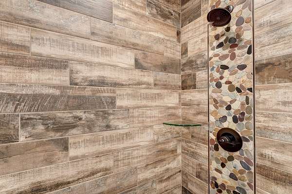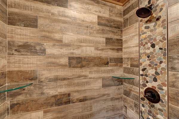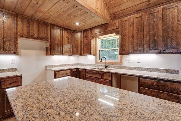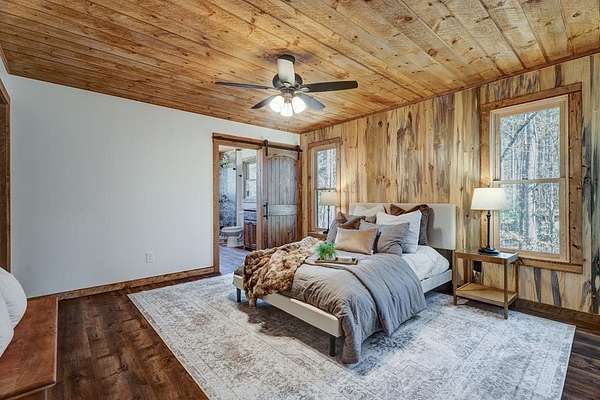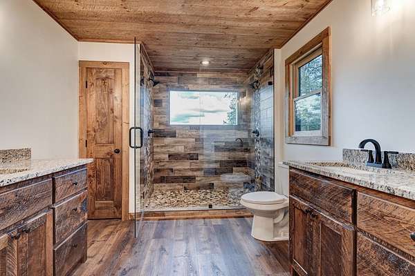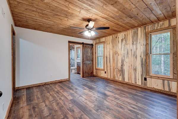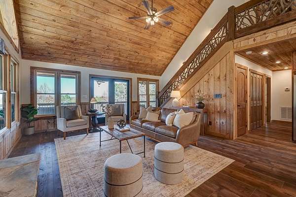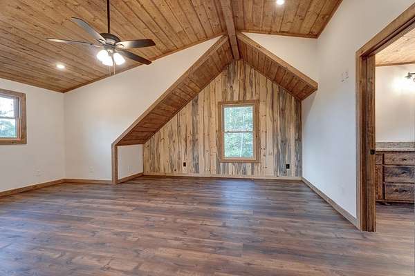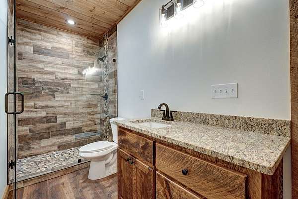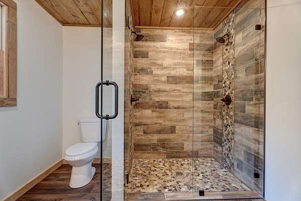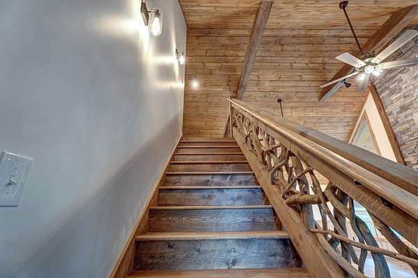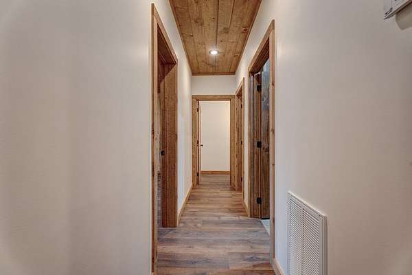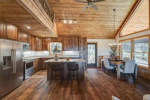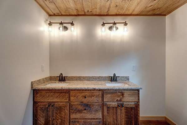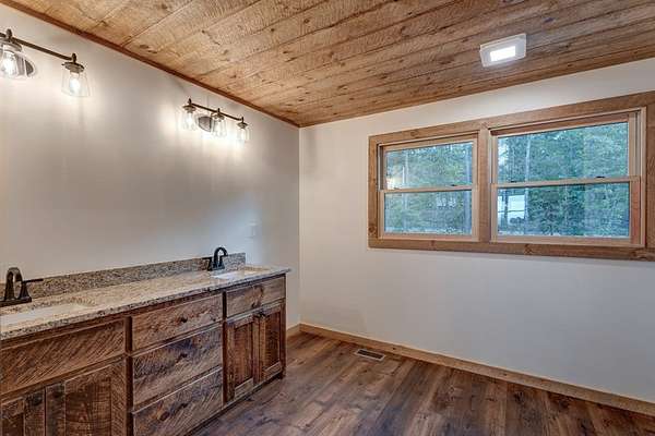 This traditional craftsman new construction with a long-range mountain view is nestled on a quiet, paved road with level terrain located 15 minutes from downtown Blue Ridge. This 4-bedroom, 4-bathroom is built in the traditional Craftsman style, every detail reflects quality craftsmanship and thoughtful design. There is a spacious, open-concept layout with premium finishes throughout, including granite countertops, elegant fixtures, and rich wood accent walls as well as circle sewn wood ceilings. The main level features the primary ensuite bedroom, complete with a luxurious tile shower with a view and upscale finishes. Two of the four bedrooms are ensuites, offering privacy and comfort for guests or family members. In total, the home includes three custom tile showers and an additional bath with a tile surround, blending function and style. The indoor stone fireplace is perfect for cozy mountain evenings, or take in the scenic views from the outdoor fireplace. The main-level laundry room adds convenience, while the terrace level features a wet bar and is pre-wired for a hot tub, offering future potential for relaxation or entertainment. The kitchen is outfitted with stainless steel appliances, granite countertops, and ample custom cabinetry. There are also two owner's closets and a mechanical room located on the terrace level.