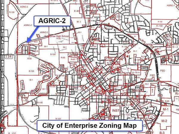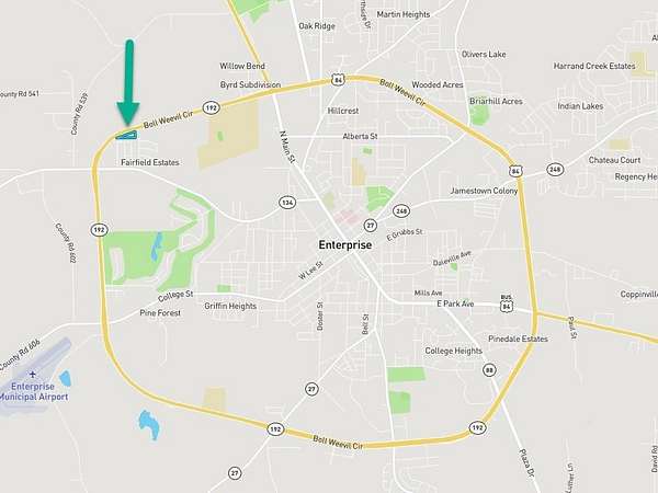 Est $1,137/moCommercial Investment Opportunity! 3.45 surveyed acres of prime commercial property. This parcel has 830 feet of frontage on the Boll Weevil Circle in Enterprise. The triangle-shaped parcel is over 300 feet deep on the east boundary. Parcel is currently zoned Agricultural-2. This is an excellent location for various commercial uses & located on the NW corner of Boll Weevil Circle between Hwy 134 & the Enterprise High School. Average traffic count of 7,549 (2024, ALDOT) City water, city sewer, electric available-Alabama Power, gas available. Taxes: $139/year (2024)