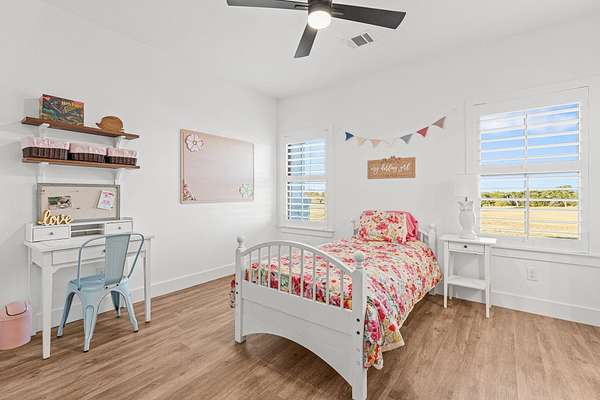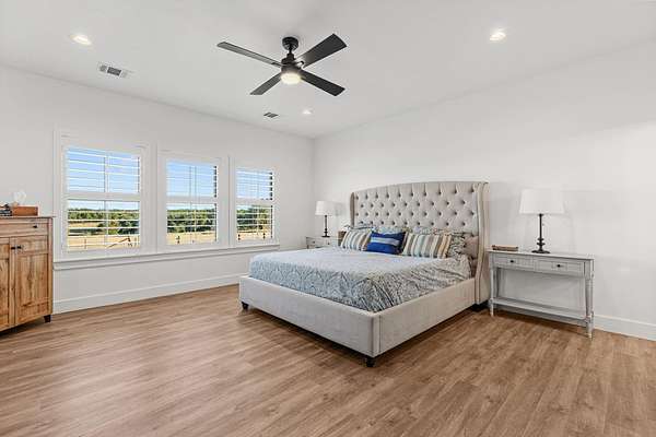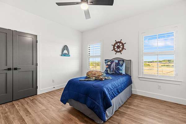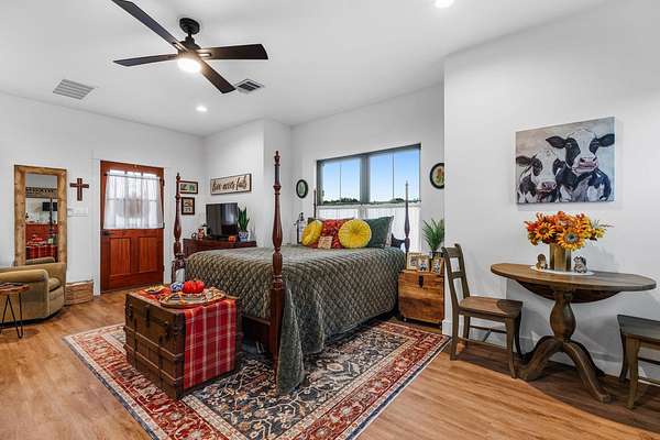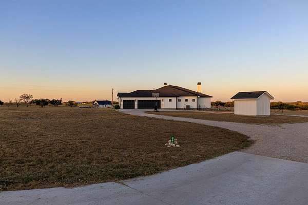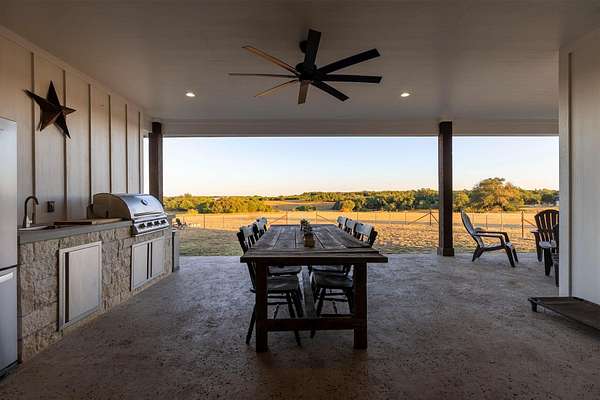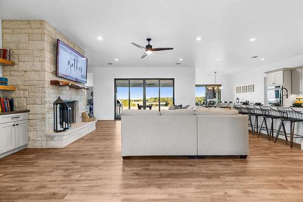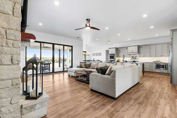 Nestled in the desirable 7 Creeks community, this 6-bedroom, 4.5-bathroom modern farmhouse offers the perfect blend of luxury and country living, sitting on 10 acres with breathtaking hill country views. The open-concept kitchen, living, and dining area features oversized sliding doors leading to a large covered patio, ideal for entertaining. The gourmet kitchen boasts KitchenAid and Electrolux Architectural Series appliances, custom cabinetry, quartz countertops, and a spacious walk-in pantry. The living room is highlighted by a cozy fireplace and open shelving, creating a warm and inviting space for relaxing or displaying your favorite decor. Thoughtful design touches include a mudroom organization station, a laundry room with cabinetry, and a sink for added convenience. A dedicated office offers a quiet space for work, while the attached casita provides a private entrance, full bath, kitchenette, and laundry closet-perfect for guests or a home studio. The luxury primary suite includes a spa-like bath and an oversized walk-in closet. A beautifully designed Jack and Jill bath with double sinks connects two guest bedrooms. This home includes a propane-powered whole-house generator, well-house full gutters, a water softener, and a 3-car garage. The large covered patio features an outdoor kitchen, fireplace, and TV wiring, making it ideal for outdoor living and entertaining. The property is partially fenced for pets and offers privacy with expansive views. The 7 Creeks community is a peaceful, wildlife-exempt neighborhood with reduced property taxes and easy access to local parks, shopping, and schools. For a modern farmhouse that combines luxury, comfort, and scenic hill country living, this home is a mustsee. Schedule a private tour today! Age