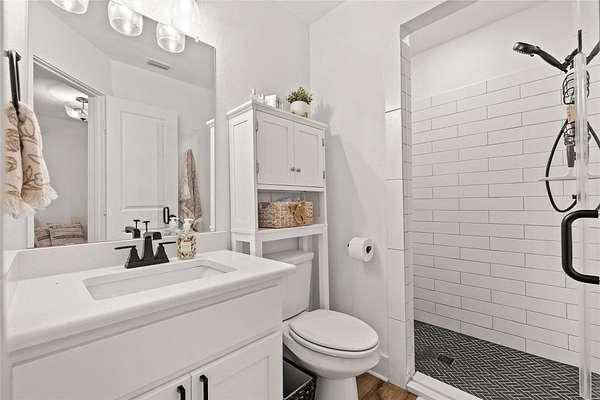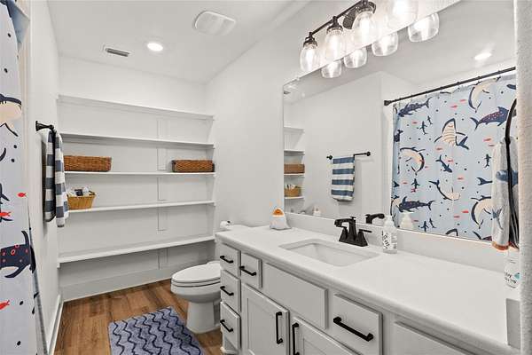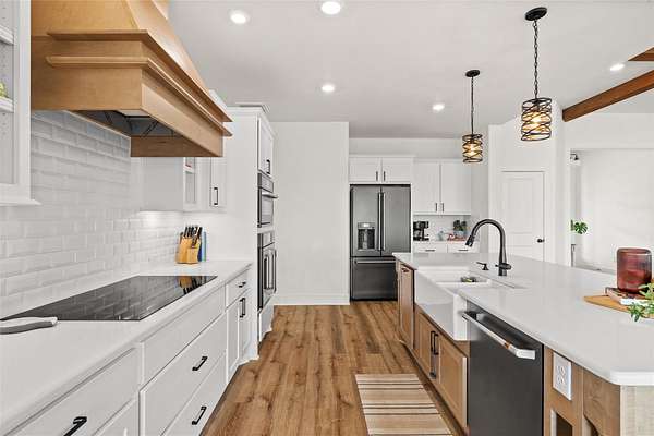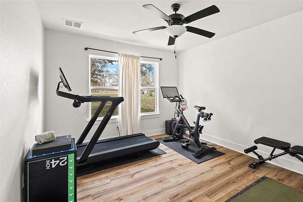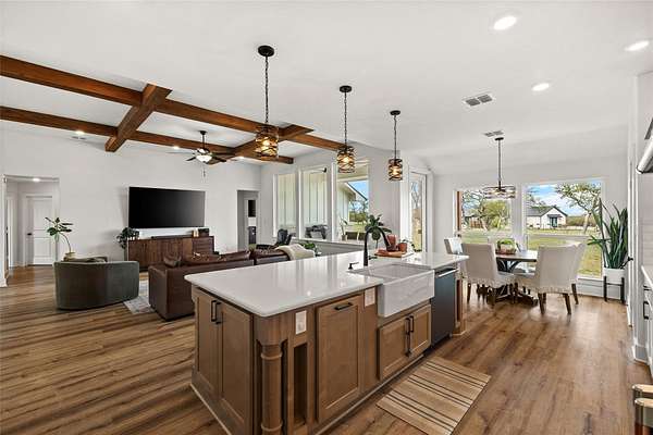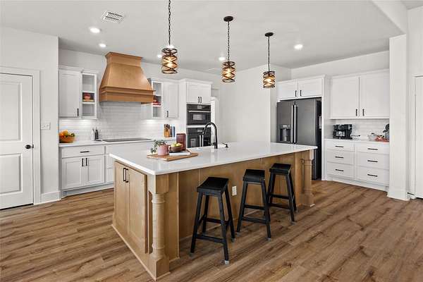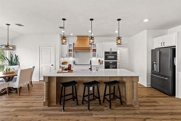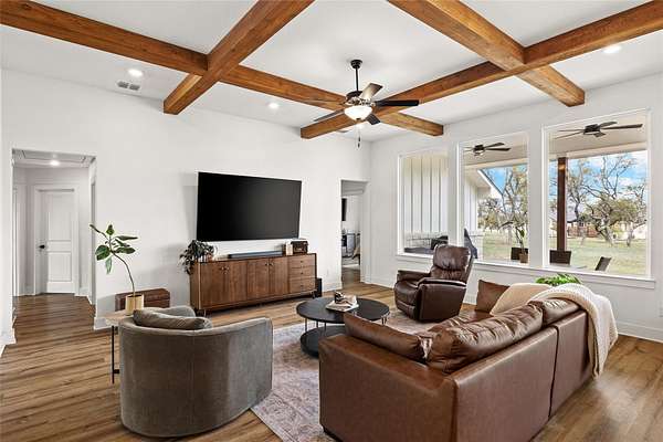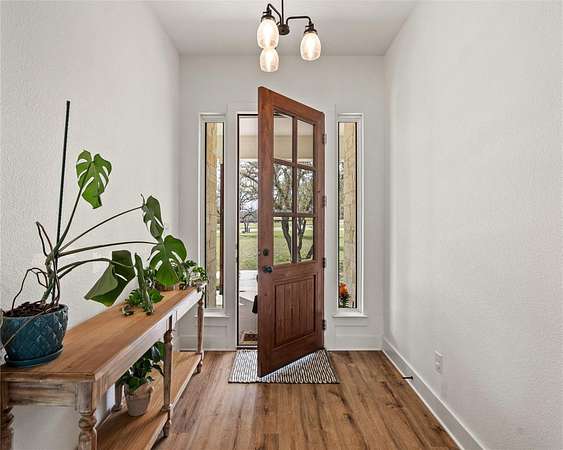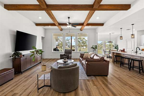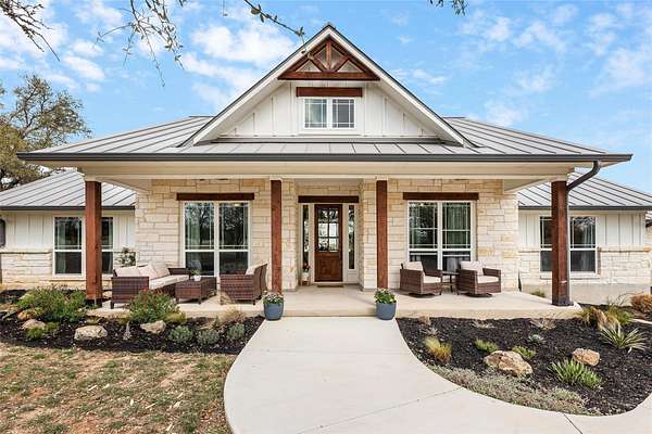 Set within the private gated community of Trinity Oaks Preserve in Round Mountain known for its large estate lots and beautifully manicured streets, 345 Morning Dew Drive offers a rare opportunity to own a newer luxury home in one of the Hill Country's most peaceful and scenic settings. Built in 2023, this thoughtfully designed single story residence blends modern comfort with relaxed Hill Country living, all surrounded by wide-open skies and natural beauty. Inside, the home features five spacious bedrooms and four full bathrooms, with an open, flowing layout designed for both everyday living and effortless entertaining. The kitchen opens seamlessly to the main living area, creating a welcoming central gathering space with generous room for family and guests. Luxury vinyl plank flooring runs throughout the home, providing both durability and style while tying the spaces together with a clean, contemporary feel. One of the standout features of this property is the attached guest quarters, offering a private living area, large bedroom, and full bath-perfect for extended family, visiting guests, or a comfortable multi-generational living arrangement. The primary suite is generously sized, offering a quiet retreat, while the secondary bedrooms are equally spacious and thoughtfully positioned. Outdoor living is just as inviting, with both front and back porches that capture the charm of Hill Country life-ideal for morning coffee, evening sunsets, and enjoying the peaceful surroundings. With its combination of newer construction, lower taxes, privacy, large homesites, and quality finishes, 345 Morning Dew Drive represents a rare luxury offering in Round Mountain-where space, comfort, and a slower pace of life come together beautifully.