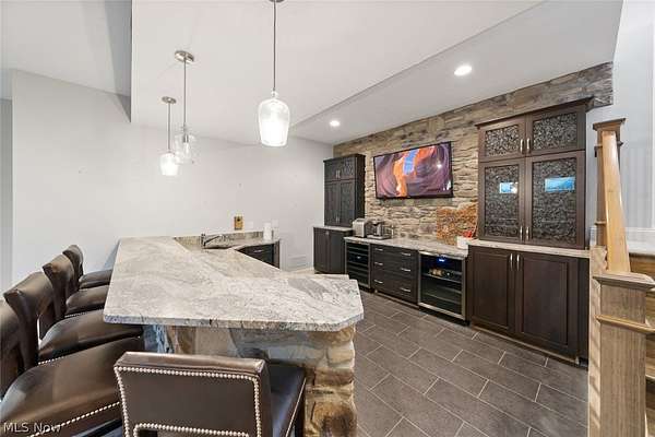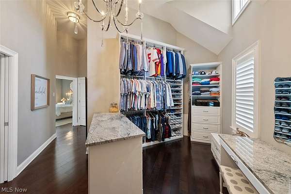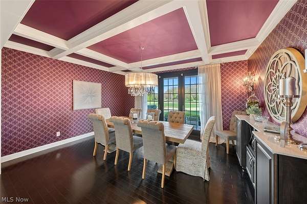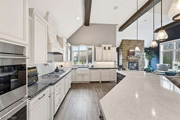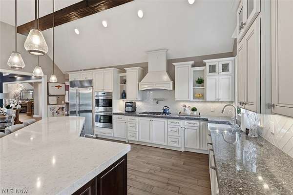 - Beamed Ceilings, Bookcases, Built In Features, Cathedral Ceilings, Ceiling Fans, Chandelier, Coffered Ceilings, Crown Molding, Double Vanity, Dry Bar, Eat In Kitchen, Entrance Foyer, Granite Counters, High Ceilings, Kitchen Island, Open Floorplan, Pantry, Primary Downstairs, Recessed Lighting, Sound System, Wet Bar