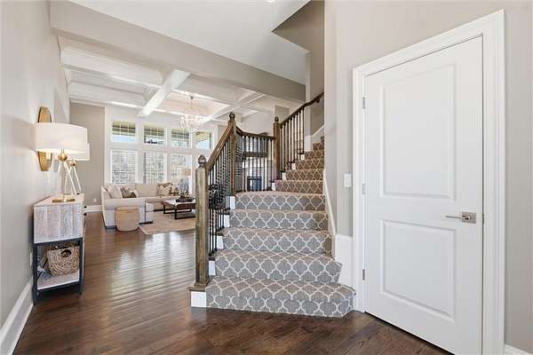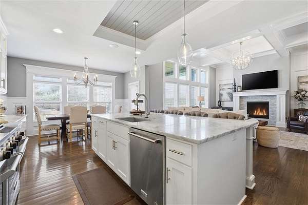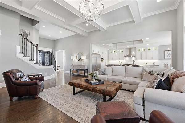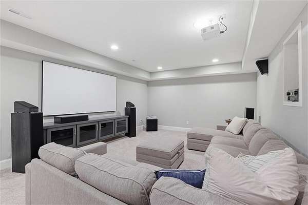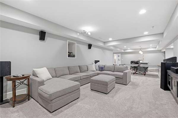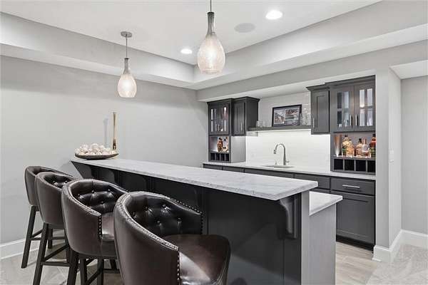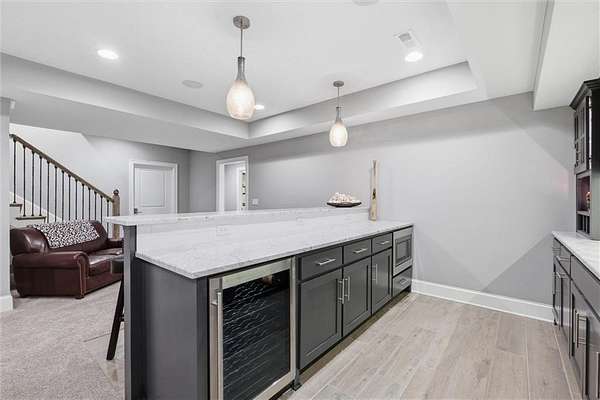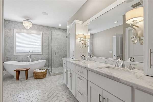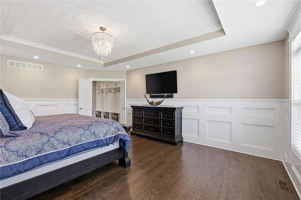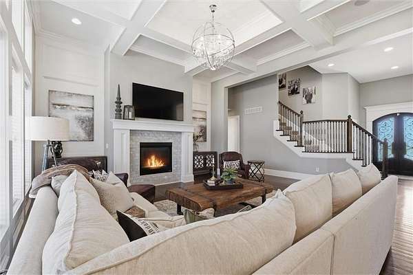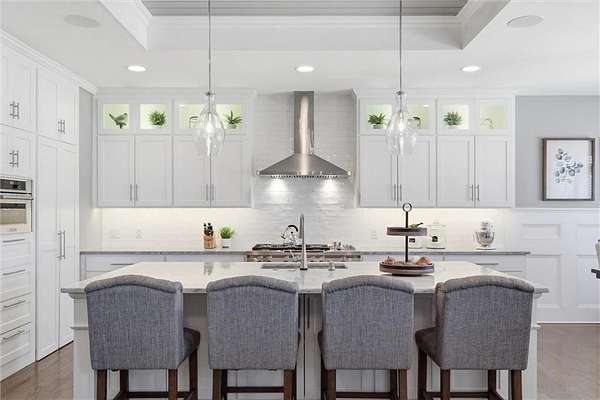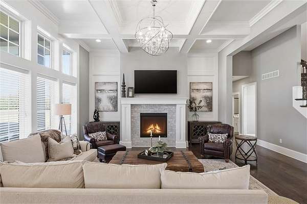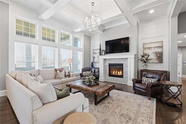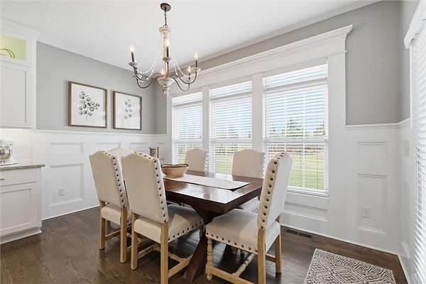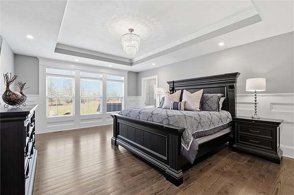 Exquisitely designed custom home on a picturesque 2.21-acre tree-lined lot in the award-winning Blue Valley School District. A commanding circle drive leads to a sprawling, light-filled floor plan featuring high ceilings and a stunning fireplace. The gourmet chef's kitchen is a masterpiece with custom cabinets, upgraded appliances + oversized side by side Frigidaire fridge and freezer combo, a butler's pantry, and quartzite and granite counters. This rare find offers three bedrooms plus a private office on the main level, including a spa-like master suite with marble tile, a freestanding tub, and oversized "his and hers" closets & dual vanities. Useful back hall boot niche off the garage. Upstairs, discover a charming hidden playroom, while the sensational finished lower level adds a 7th bedroom, 6th full bath, handsome bar, and ample storage. 3 car side entry, custom millwork thru out, boxed beam ceiling, safe room, new exterior paint, upgraded light fixtures, 8-year-old roof & hvac - projection screen in LL to stay, gorgeous quartzite tops in all baths. Enjoy breathtaking sunsets from the extended covered patio with cozy fireplace overlooking a level backyard-perfect for a future pool. Neighborhood amenities include a private lake and walking trail, offering peaceful estate living just minutes from the city. Don't miss this luxurious one-of-a-kind custom-built masterpiece!