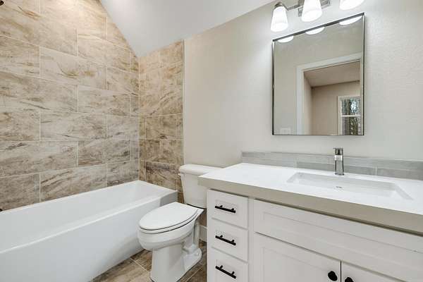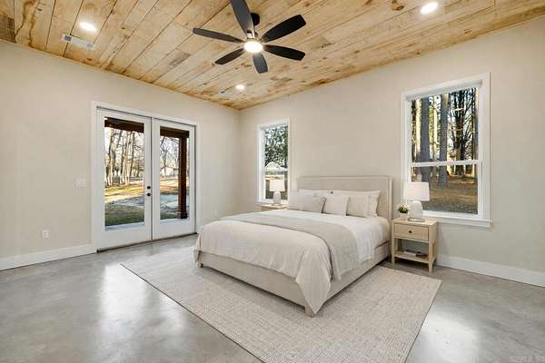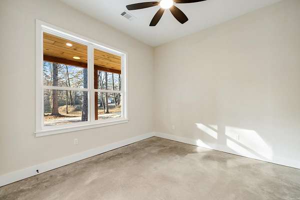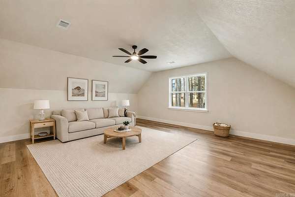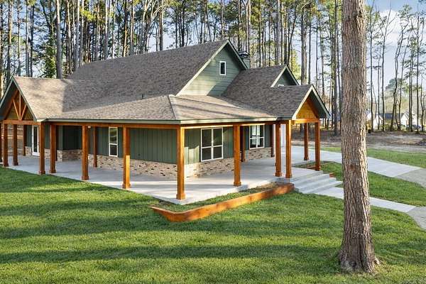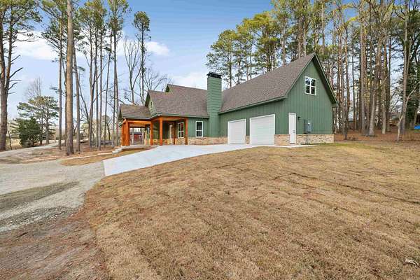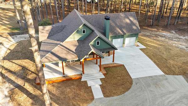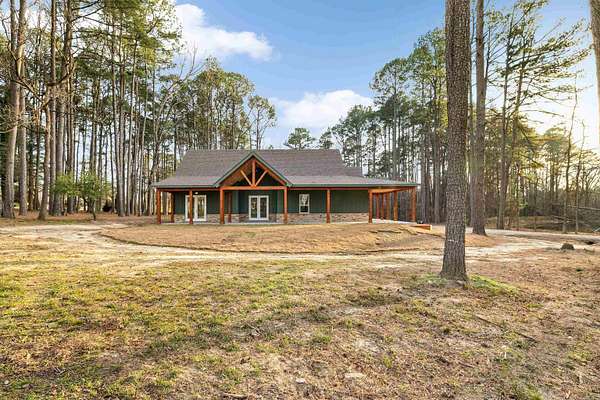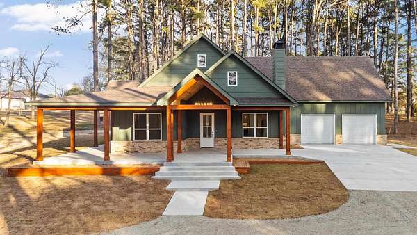 NEW CONSTRUCTION ON 1.8 ACRES IN TOWN! Feel like you have escaped to your own VRBO every day in this rustic charmer with over 1200 square feet of covered porches. Living room features cathedral ceiling with hand sawn wood and wood burning fireplace. Open kitchen with walk in pantry, breakfast bar, refrigerator, and spacious dining area. Primary suite features wood ceiling, double vanities, free standing tub, custom tile shower and large walk in closet. Two other bedrooms with shared bath along with half bath on main level. Upstairs is spacious bonus room, full bathroom, and bedroom. Oversized garage and spacious laundry room with sink. Flat usable lot with mature trees and view of pond. 5 minutes to Military road!
