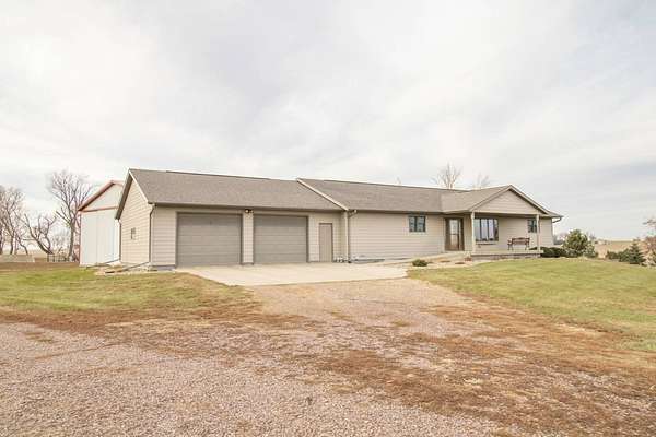 This 3.42-acre property outside of Boyden, IA offers a comfortable ranch-style home and an excellent selection of outbuildings for work, storage, or hobbies. The main floor features a spacious living room, an eat-in kitchen with adjoining dining area, the primary bedroom with its own bathroom access, three additional bedrooms, a full bathroom, and main-floor laundry. The walk-out basement adds even more usable space with a large family room, a kitchenette, a full bathroom, an additional bedroom plus a nonconforming bedroom (needs egress), mechanical room, and storm cellar. Outside, the acreage is equipped with several functional outbuildings, including a 39 x 39 machine shed with 15 x 17 sliding doors and a cement floor, a 20 x 40 chicken coop, an older barn, and a 25 x 42 insulated storage building with three overhead doors and a cement floor-providing outstanding versatility for equipment, livestock, and storage needs. Contact us today for more details!
