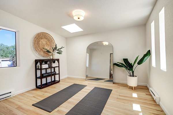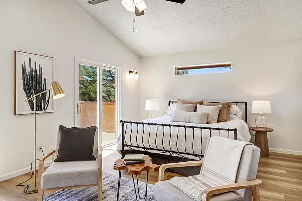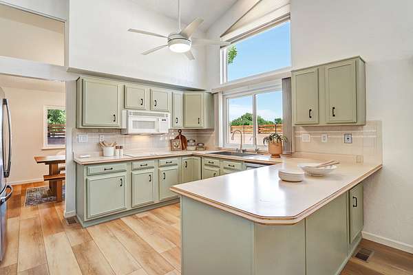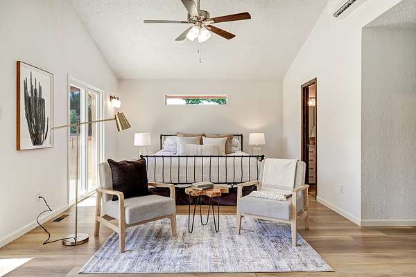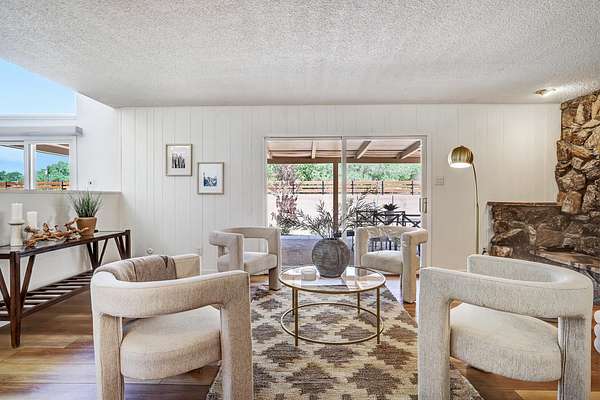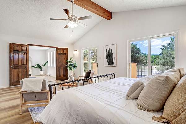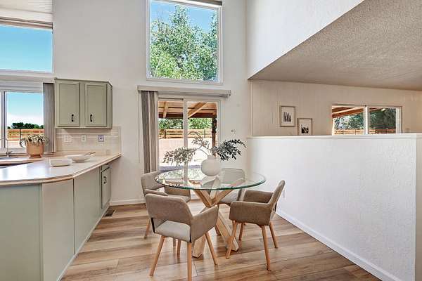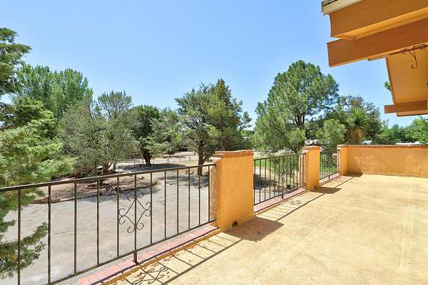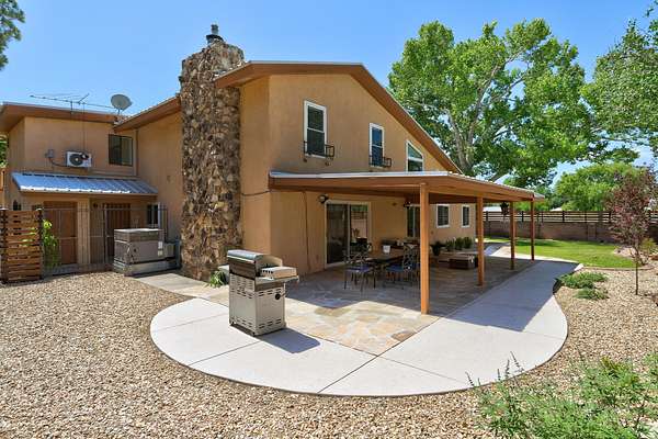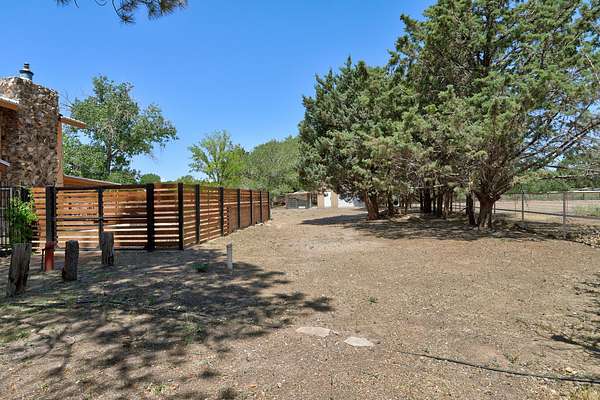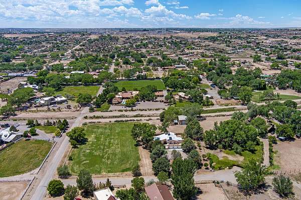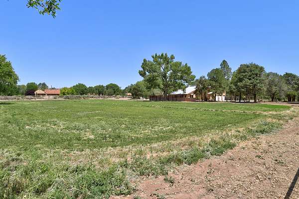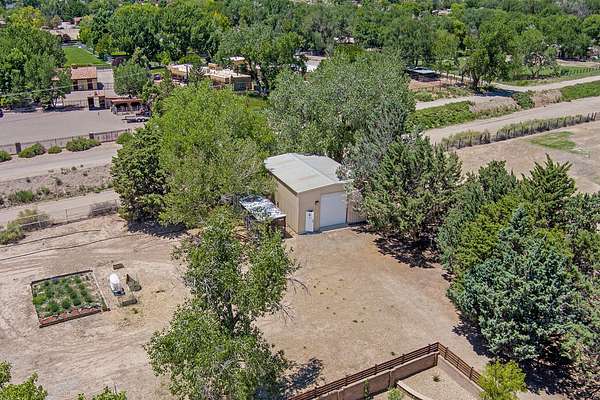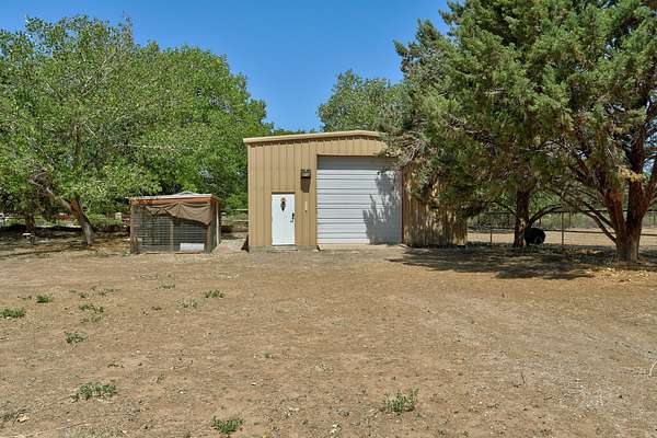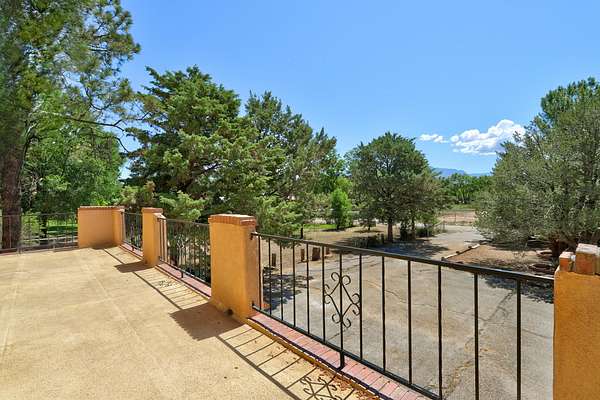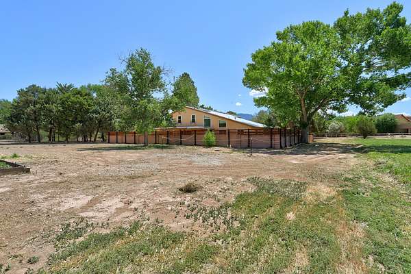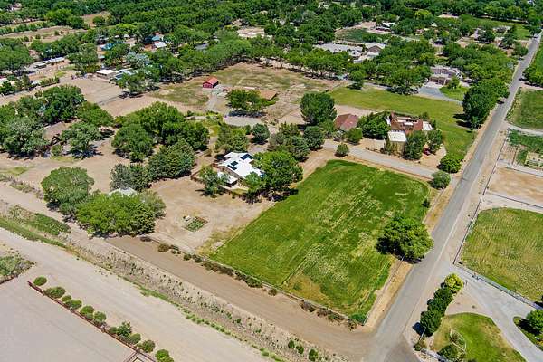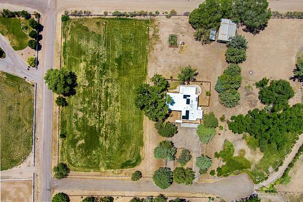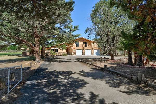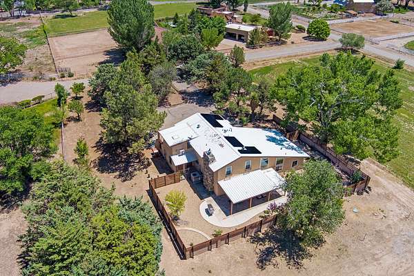 Greenbelt 2.4 acre home in the southside of Corrales. This property has been updated with a farmhouse feeling of comfort and serenity. Beautiful living starts with the entry. This house invites you in to enjoy the Lux vinyl plank flooring and new iron stair railing. Downstairs offers 2 living areas, dining room, open kitchen with lots of counter space. Enjoy a guest room and 3/4 bath downstairs, for multi-gen living. Upstairs you will find a large primary suite with an attached office/workout area and balcony. Two additional guest beds and hall bath. Enjoy the peaceful backyard and patio or raise chickens, grow crops and imagine your dream. Large metal building is 1.5 stories high and 30ft X 40ft. Enjoy refrigerated AC with the paid-off solar system to reduce your electric bills.