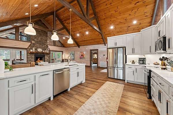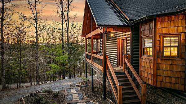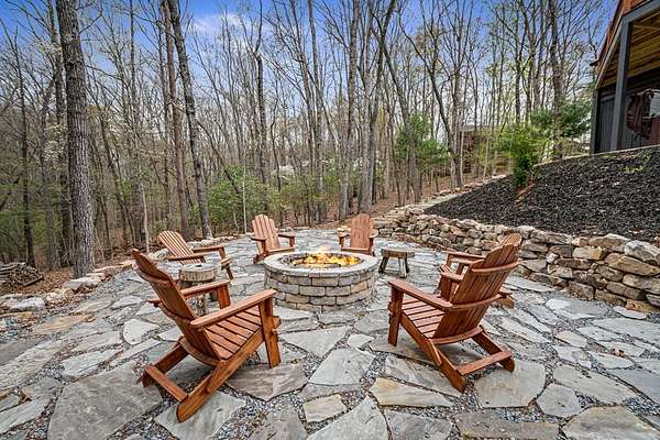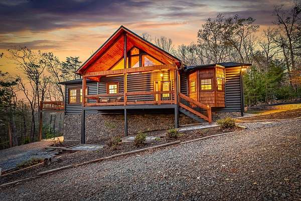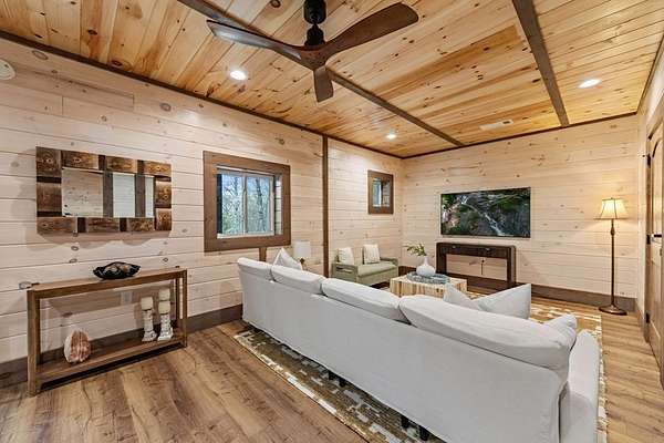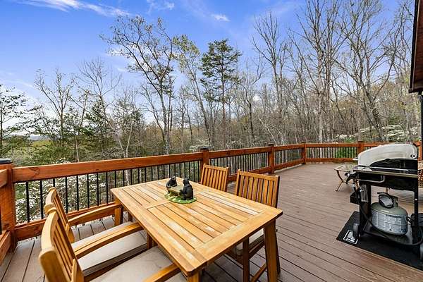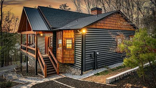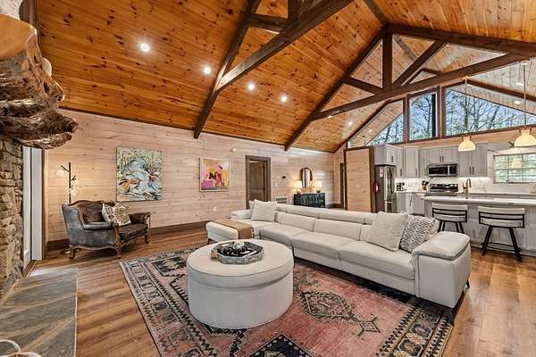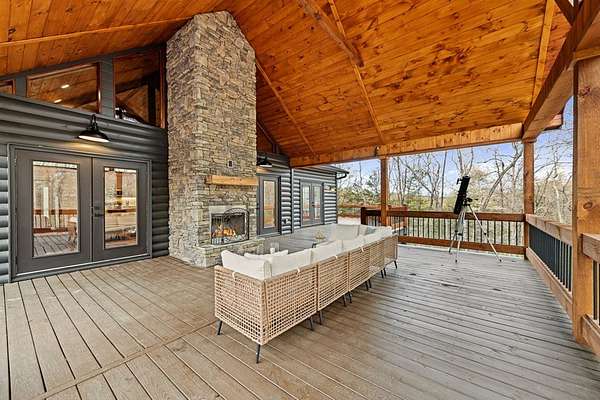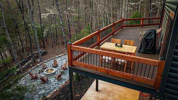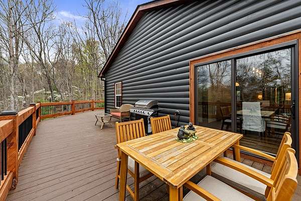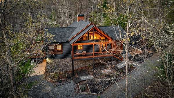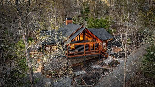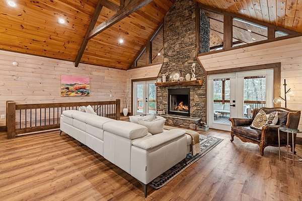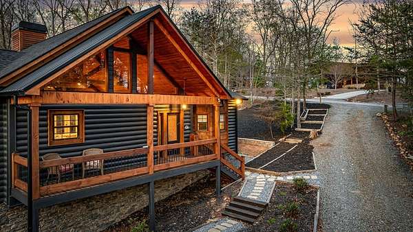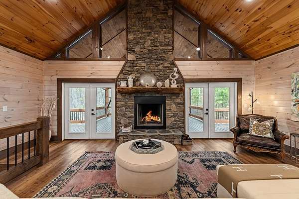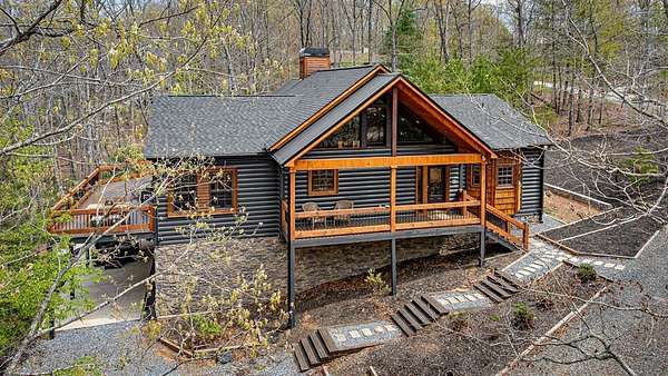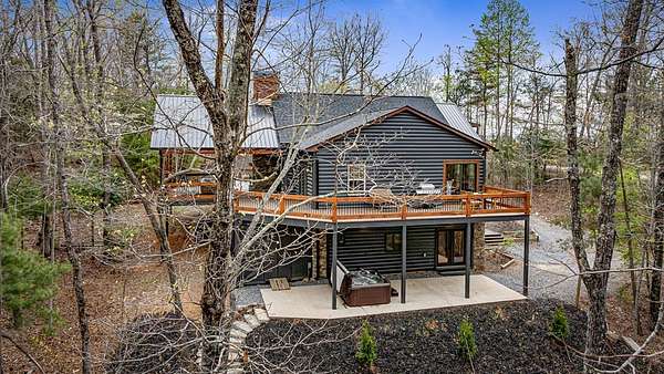 Welcome to 346 Logan Drive: a refined rustic chalet offering elevated mountain living in a private gated community just minutes from Old Toccoa Farm, the Toccoa River, and Downtown Blue Ridge. Spanning over 3,500 square feet, this 4-bedroom, 3-bath retreat blends warm mountain character with chic, comfortable finishes throughout. Soaring cathedral ceilings and walls of glass create a bright, open atmosphere, while a dramatic stone fireplace anchors the main living space. The open-concept floor plan flows seamlessly into a beautifully appointed chef's kitchen with premium appliances, generous prep space, and thoughtful design details that elevate everyday living. The kitchen and living space tie into the large formal dining space perfect for family dinners and large-scale entertaining. The main level extends to a sprawling grand covered outdoor living area complete with its own fireplace, offering the perfect setting for year-round entertaining with canopy and mountain views. Each bedroom ensuite features gorgeous walk-in tile showers with glass enclosures. Designer stone countertops and fixtures adorn each space. The terrace level features an expansive secondary living space with a full wet bar, ideal for hosting guests or creating a private retreat for extended stays. Each bedroom is spacious and inviting, and the outdoor setting of the terrace level patio with the hot tub or the custom stone fire pit for relaxed evenings under the North Georgia sky create a zen-like cabin retreat. Offered fully furnished and turn-key, this home is well-suited as a full-time residence, luxury second home, or income-producing short-term rental. 346 Logan Drive delivers privacy, style, and convenience in one of Mineral Bluff's most desirable gated communities.