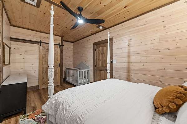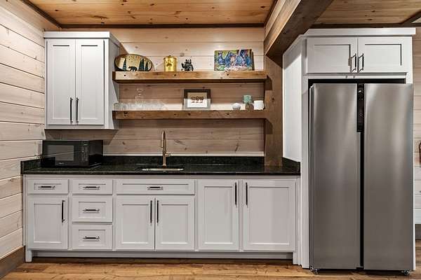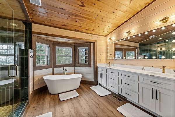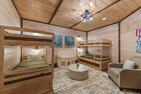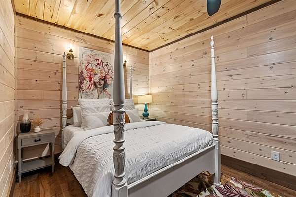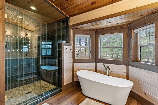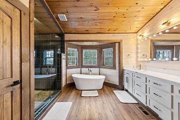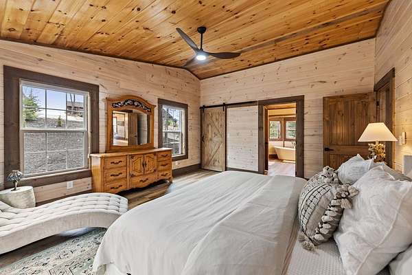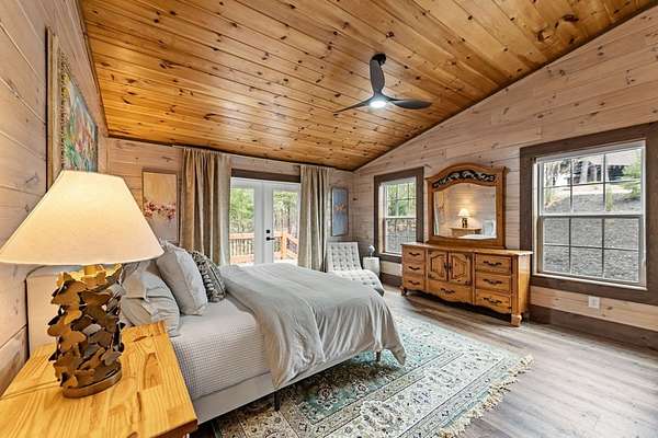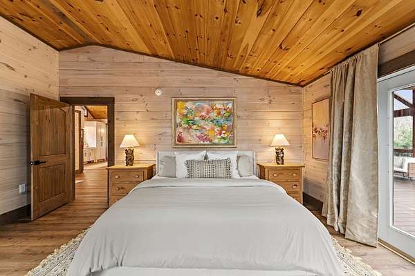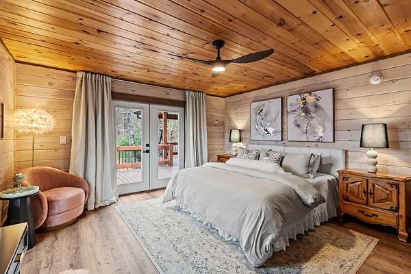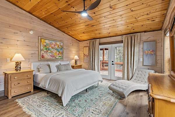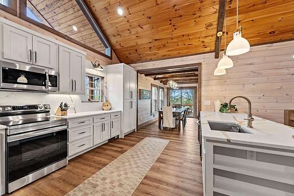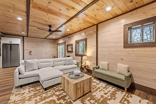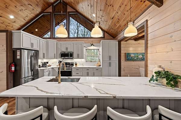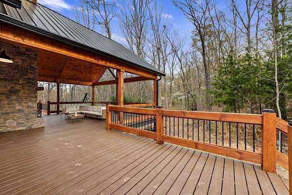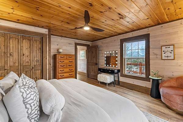Welcome to 346 Logan Drive: a refined rustic chalet offering elevated mountain living in a private gated community just minutes from Old Toccoa Farm, the Toccoa River, and Downtown Blue Ridge. Spanning over 3,500 square feet, this 4-bedroom, 3-bath retreat blends warm mountain character with chic, comfortable finishes throughout. Soaring cathedral ceilings and walls of glass create a bright, open atmosphere, while a dramatic stone fireplace anchors the main living space. The open-concept floor plan flows seamlessly into a beautifully appointed chef's kitchen with premium appliances, generous prep space, and thoughtful design details that elevate everyday living. The kitchen and living space tie into the large formal dining space perfect for family dinners and large-scale entertaining. The main level extends to a sprawling grand covered outdoor living area complete with its own fireplace, offering the perfect setting for year-round entertaining with canopy and mountain views. Each bedroom ensuite features gorgeous walk-in tile showers with glass enclosures. Designer stone countertops and fixtures adorn each space. The terrace level features an expansive secondary living space with a full wet bar, ideal for hosting guests or creating a private retreat for extended stays. Each bedroom is spacious and inviting, and the outdoor setting of the terrace level patio with the hot tub or the custom stone fire pit for relaxed evenings under the North Georgia sky create a zen-like cabin retreat. Offered fully furnished and turn-key, this home is well-suited as a full-time residence, luxury second home, or income-producing short-term rental. 346 Logan Drive delivers privacy, style, and convenience in one of Mineral Bluff's most desirable gated communities.