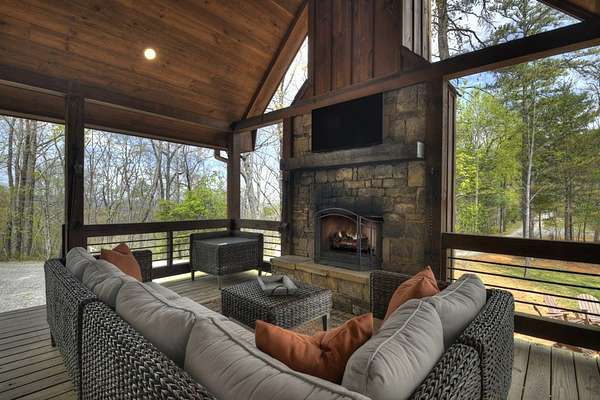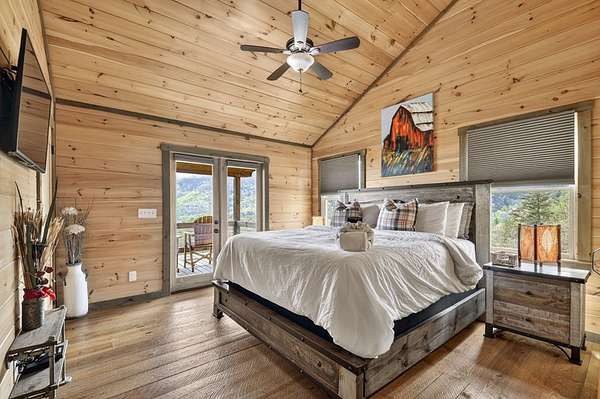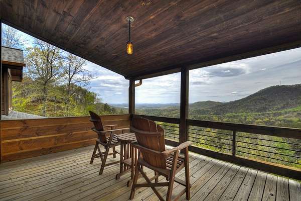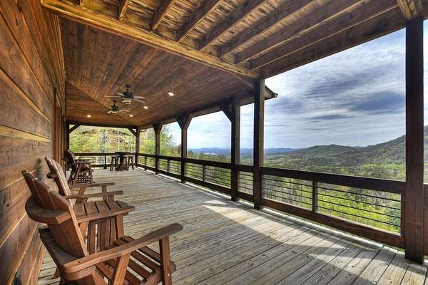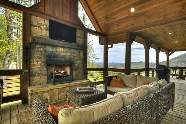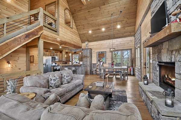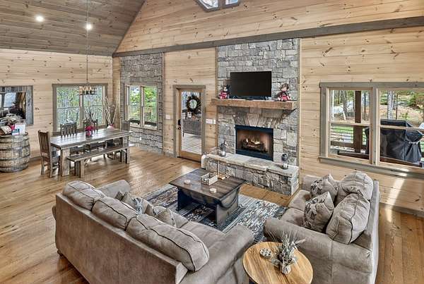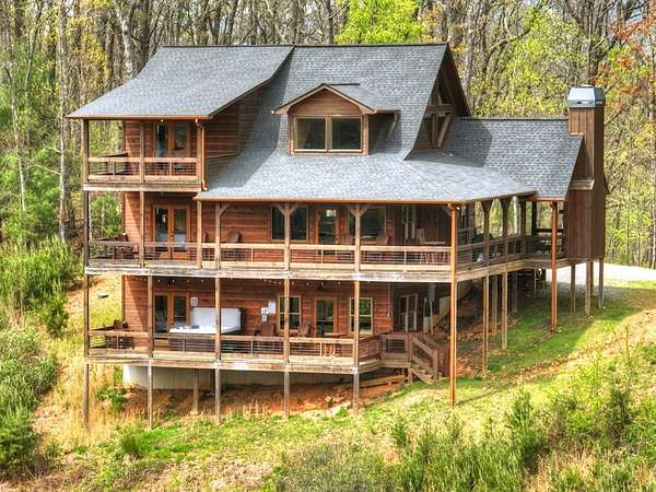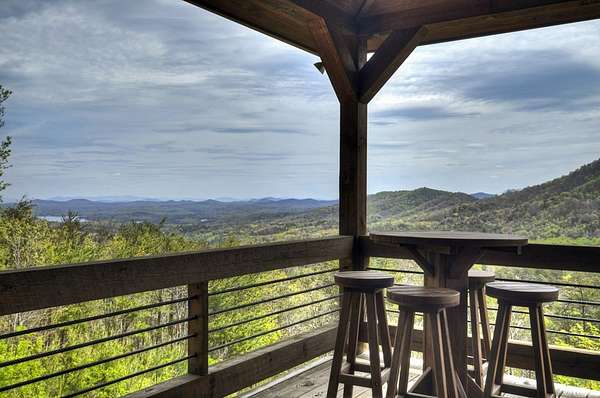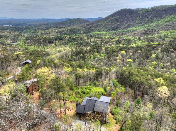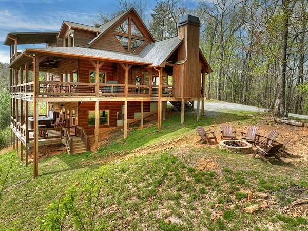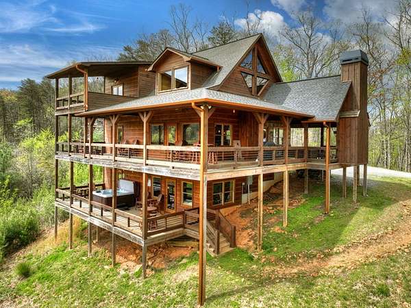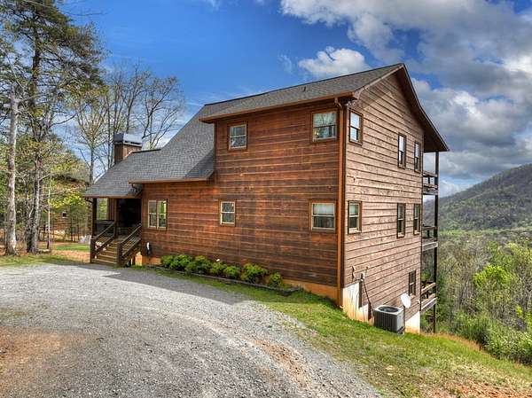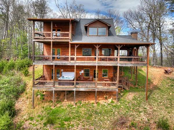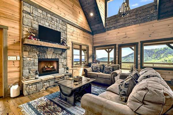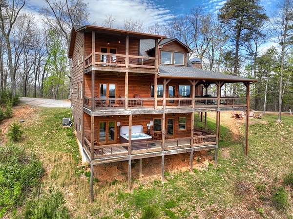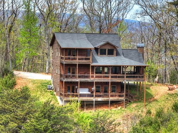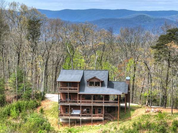 Welcome to "Aska Breeze!" Perched above the Blue Ridge landscape with sweeping panoramic views of the mountains, valley, and Lake Blue Ridge, 346 Spirit Mountain Road is a refined rustic chalet offering the perfect balance of luxury, privacy, and proven investment performance. Immaculately maintained and thoughtfully designed, this four-bedroom, three-bath retreat places you moments from the Lake Blue Ridge Marina, the Toccoa River, and nearby hiking trails, blending elevated mountain living with true convenience. The main level welcomes you with a grand open-concept living space anchored by a striking stone fireplace and framed by soaring cathedral ceilings and walls of glass that capture the ever-changing layered views. A gourmet kitchen with stainless steel appliances flows seamlessly into the dining area, creating an ideal setting for entertaining. French doors lead to expansive wraparound decks and a covered party porch complete with an outdoor fireplace—designed for year-round enjoyment. The main-level ensuite is a private sanctuary featuring a copper soaking tub, walk-in tile shower, and dual vanities. Upstairs, the primary suite is a true retreat with its own Juliette balcony overlooking the long-range views, accompanied by a spacious bunk room and an additional ensuite bath. The terrace level is built for gathering, offering a comfortable den, billiards area, and a full wet bar, along with a fourth bedroom suite for guests. Step outside to the walk-out terrace with a hot tub and direct access to the fire pit, perfectly positioned to take in the mountain backdrop under the stars. With an impressive $85,000 in gross short-term rental income for 2025 (and similar or higher numbers for previous years), this fully furnished, turn-key property delivers both an exceptional lifestyle and a compelling investment opportunity—ideal as a full-time residence, luxury retreat, or high-performing income-producing asset in the heart of Blue Ridge.