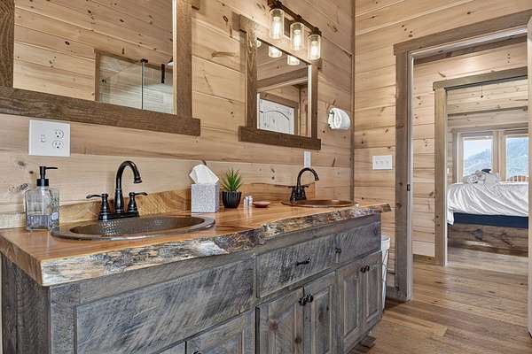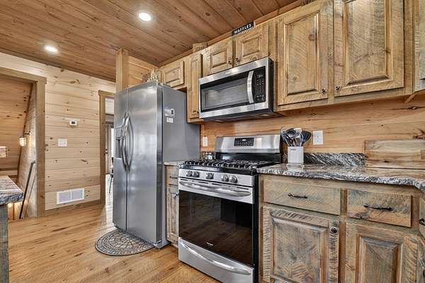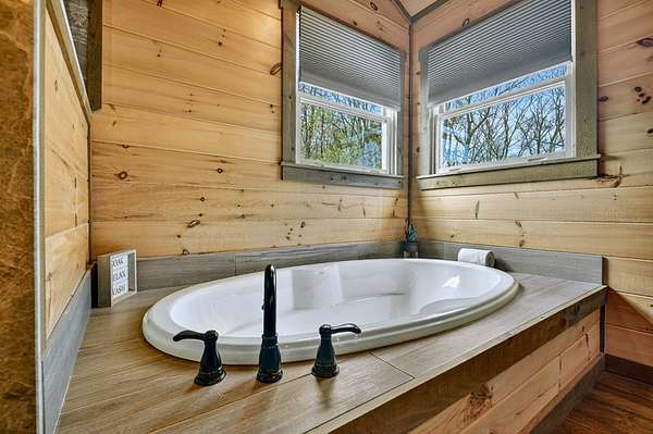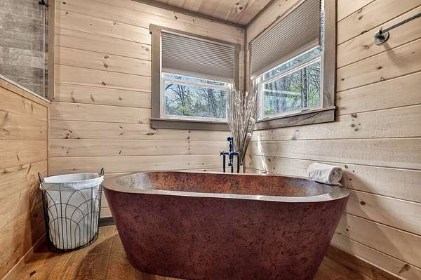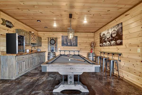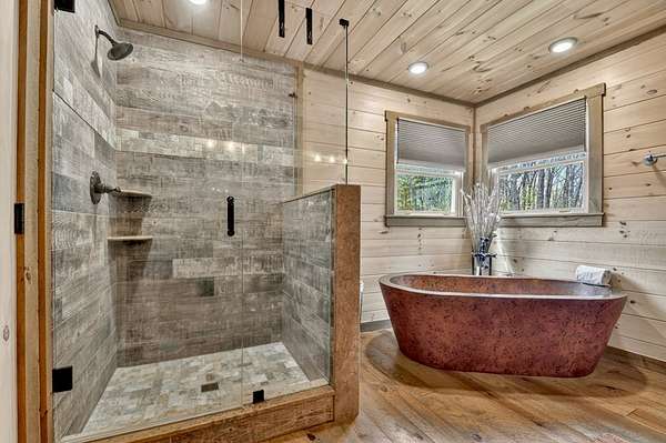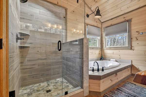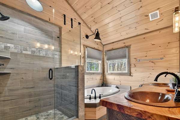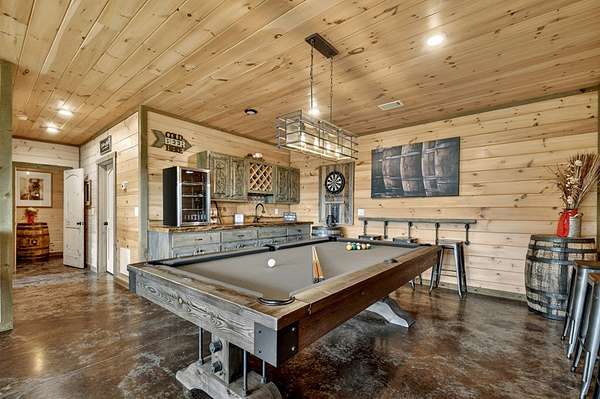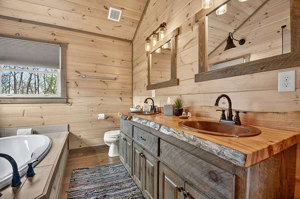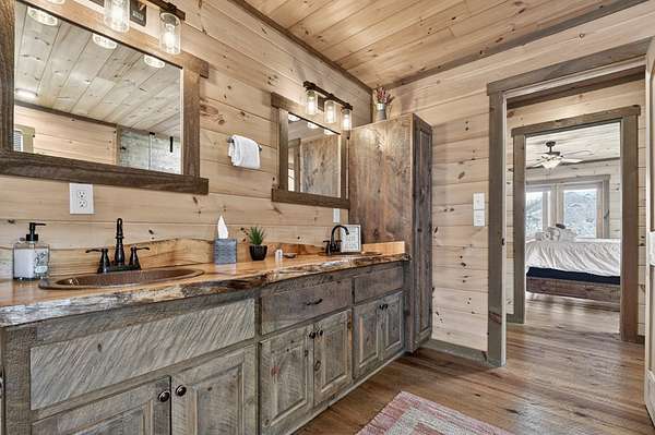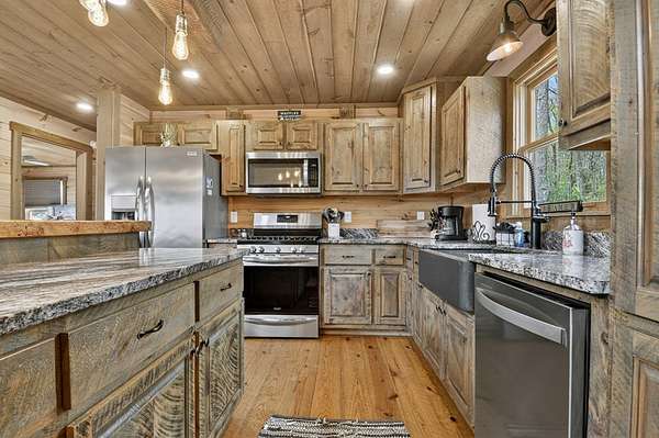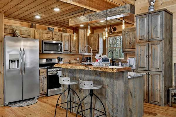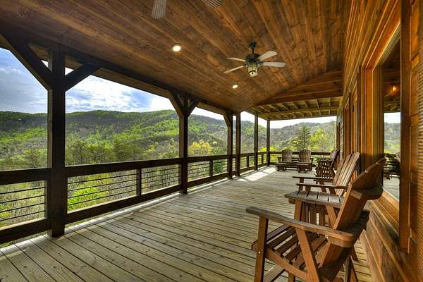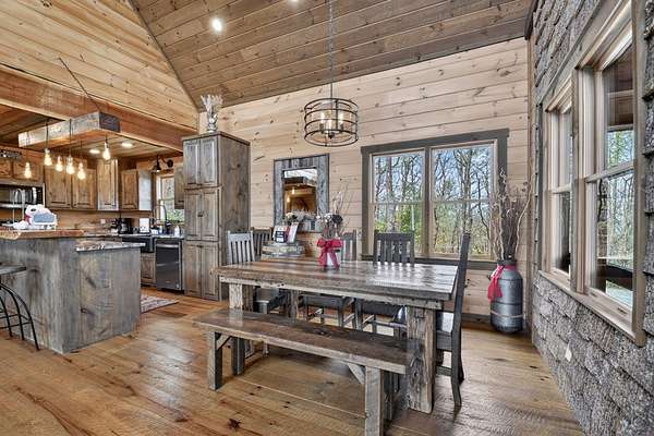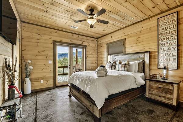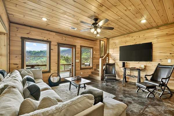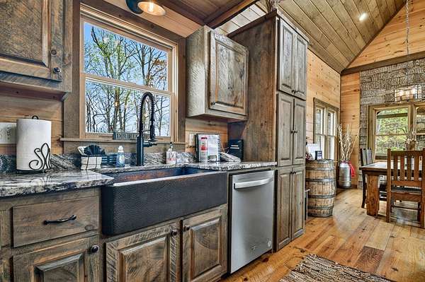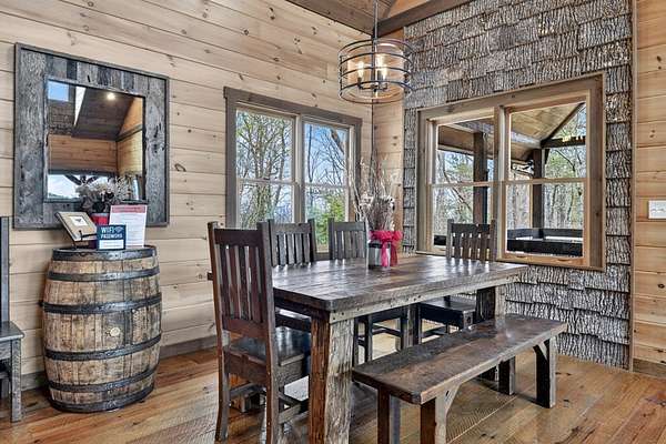 Welcome to "Aska Breeze!" Perched above the Blue Ridge landscape with sweeping panoramic views of the mountains, valley, and Lake Blue Ridge, 346 Spirit Mountain Road is a refined rustic chalet offering the perfect balance of luxury, privacy, and proven investment performance. Immaculately maintained and thoughtfully designed, this four-bedroom, three-bath retreat places you moments from the Lake Blue Ridge Marina, the Toccoa River, and nearby hiking trails, blending elevated mountain living with true convenience. The main level welcomes you with a grand open-concept living space anchored by a striking stone fireplace and framed by soaring cathedral ceilings and walls of glass that capture the ever-changing layered views. A gourmet kitchen with stainless steel appliances flows seamlessly into the dining area, creating an ideal setting for entertaining. French doors lead to expansive wraparound decks and a covered party porch complete with an outdoor fireplace—designed for year-round enjoyment. The main-level ensuite is a private sanctuary featuring a copper soaking tub, walk-in tile shower, and dual vanities. Upstairs, the primary suite is a true retreat with its own Juliette balcony overlooking the long-range views, accompanied by a spacious bunk room and an additional ensuite bath. The terrace level is built for gathering, offering a comfortable den, billiards area, and a full wet bar, along with a fourth bedroom suite for guests. Step outside to the walk-out terrace with a hot tub and direct access to the fire pit, perfectly positioned to take in the mountain backdrop under the stars. With an impressive $85,000 in gross short-term rental income for 2025 (and similar or higher numbers for previous years), this fully furnished, turn-key property delivers both an exceptional lifestyle and a compelling investment opportunity—ideal as a full-time residence, luxury retreat, or high-performing income-producing asset in the heart of Blue Ridge.