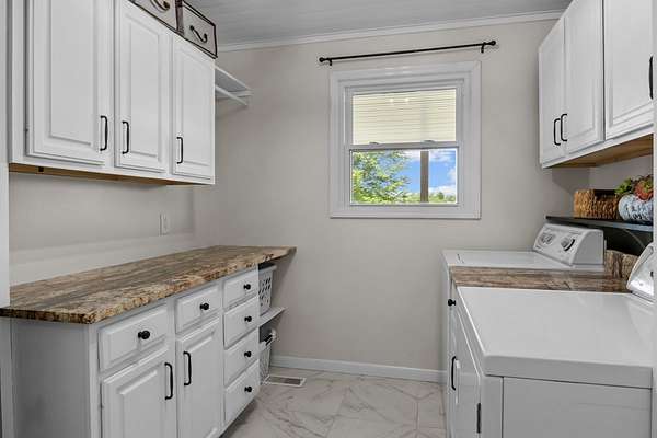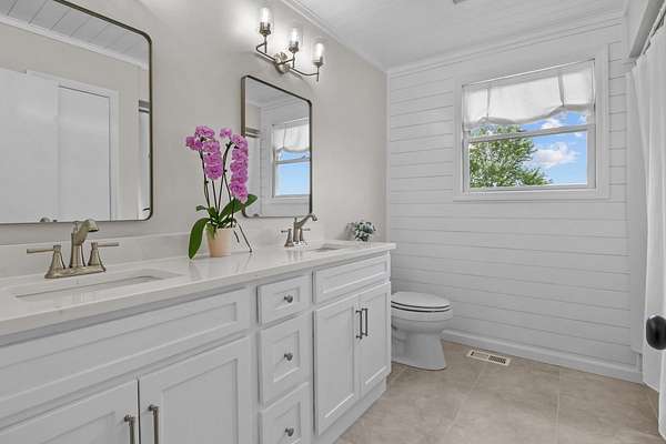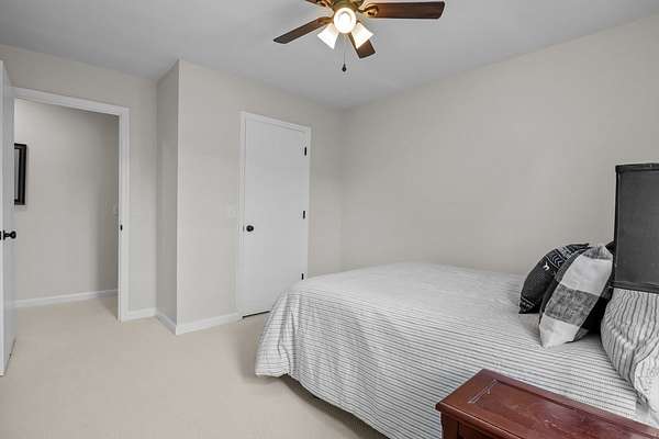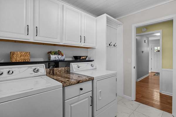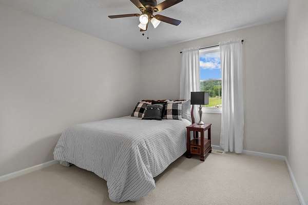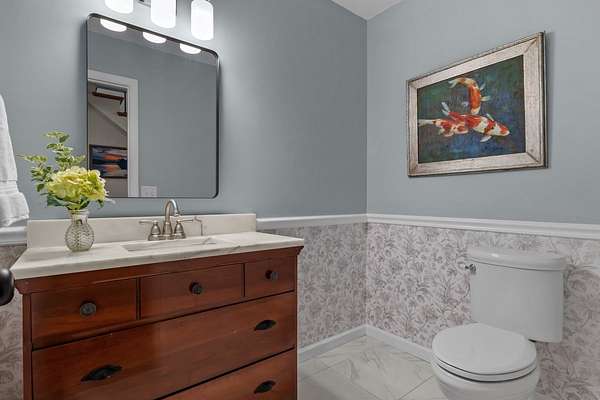 The fully renovated kitchen boasts granite countertops, stainless steel appliances, and abundant cabinetry. Hardwood floors run throughout the main level, while one upstairs bedroom features new carpet and the others offer hardwood flooring. Bathrooms have been updated with fresh paint, new vanities with quartz countertops, lighting, and tile flooring.