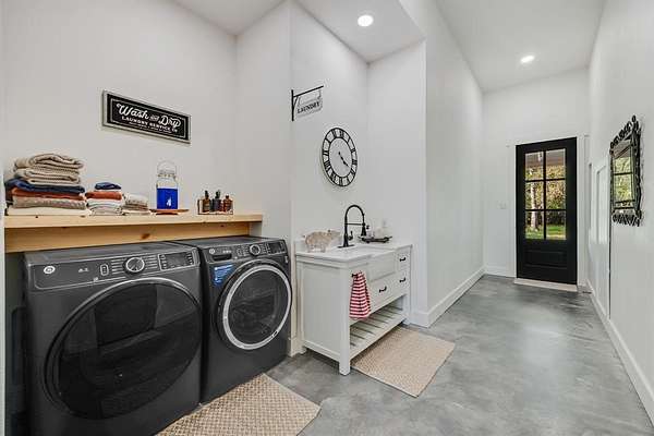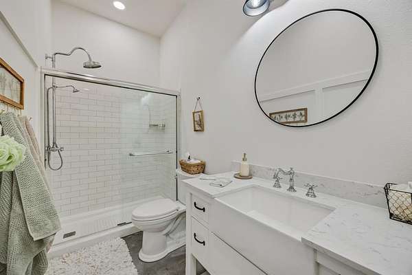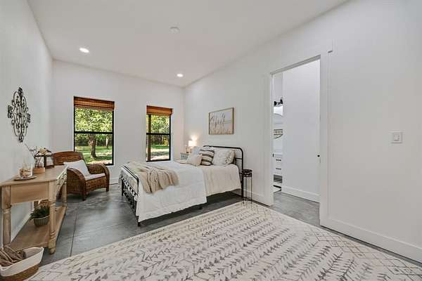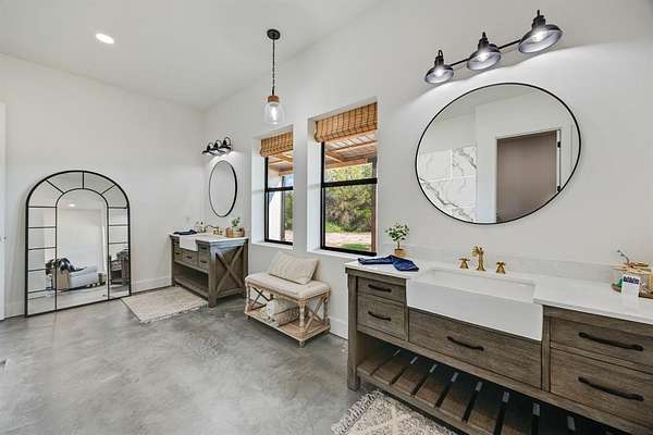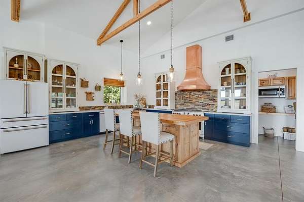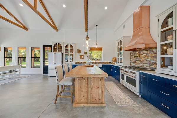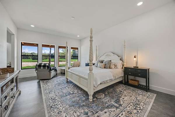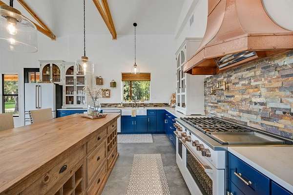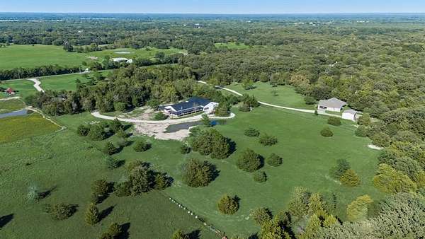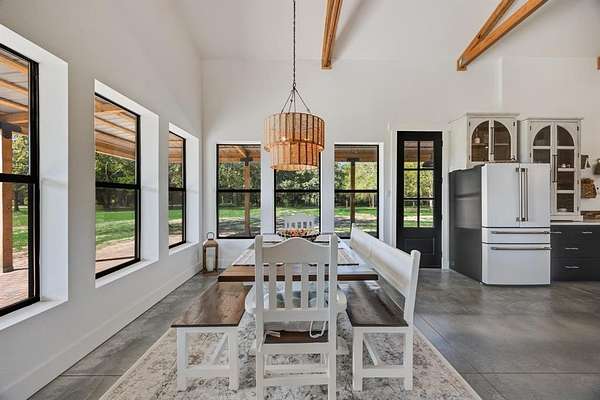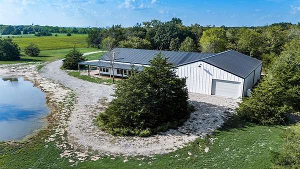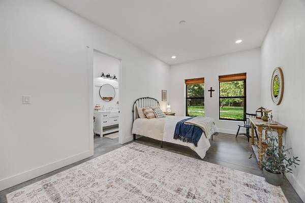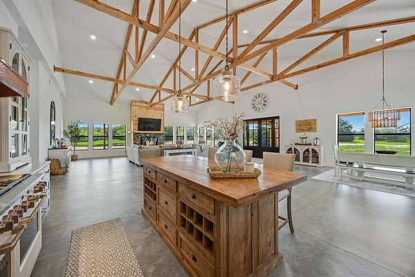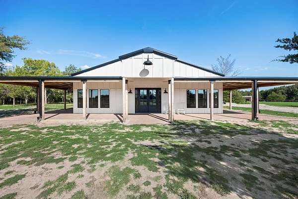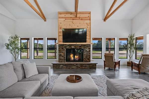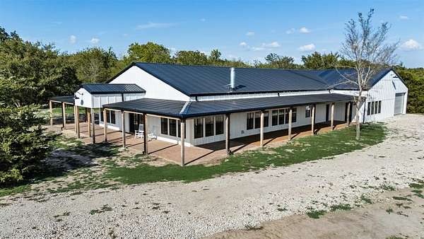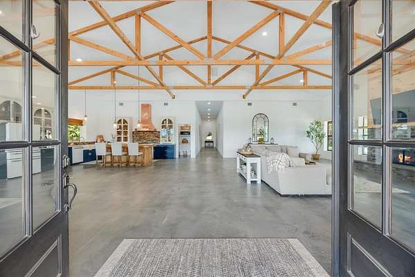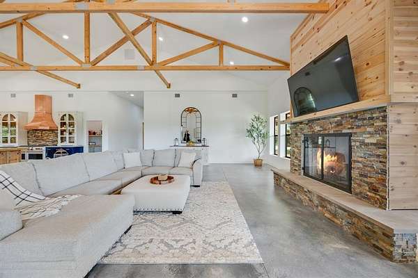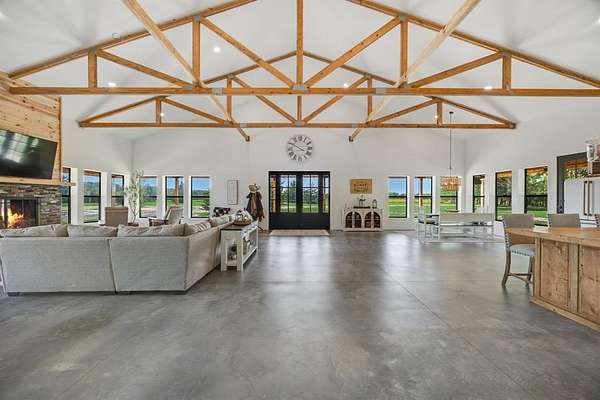 Experience refined country living on 20.54 acres with this custom 3,456 sq. ft. barndominium. The home showcases 12 ft cathedral ceilings with wood beams, solid wood doors, and an open-concept layout. Each bedroom is an en-suite, offering privacy for family and guests. Spacious rooms and faux beams continue into the 3,456 sq. ft. attached shop, which is prepped for two additional ADUs. Foam insulation ensures efficiency, while a 2,592 sq. ft. wrap-around porch provides expansive outdoor living. The property is currently ag exempt with honeybees and accessed by a 700 ft wooded driveway for a true estate feel. Conveniently located near Live Happy Lane Winery, Greenville dining, shopping, and the future Gamescape destination. There are even options for the furniture and farm equipment - please inquire!