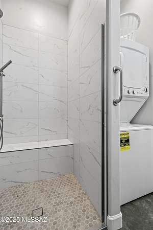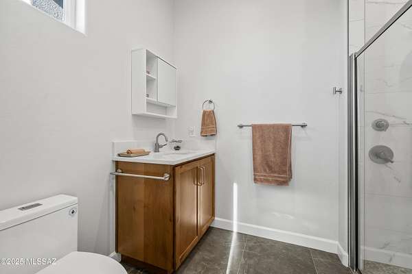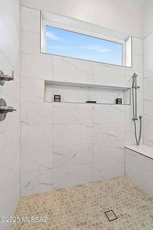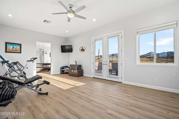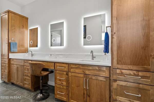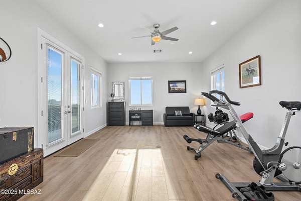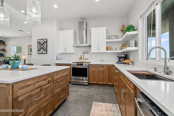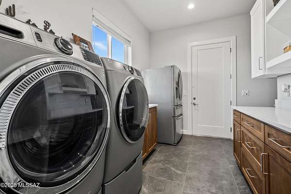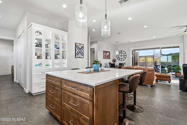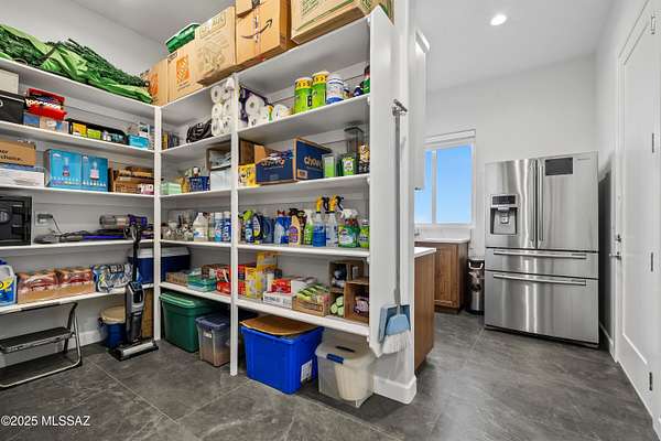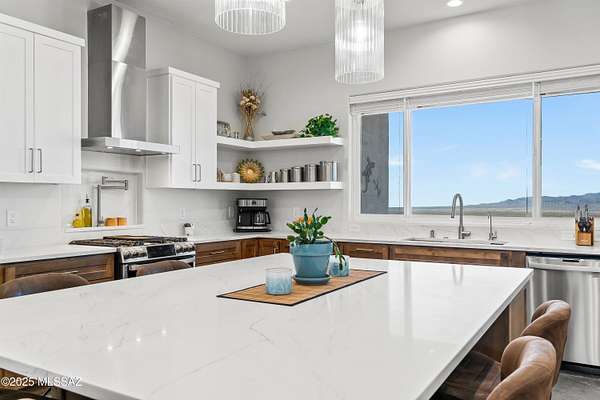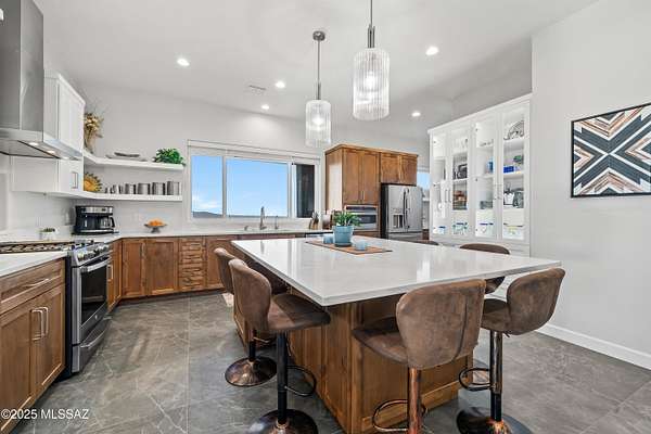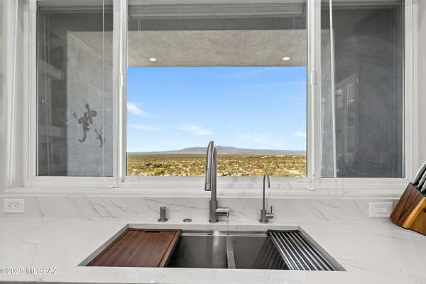 The expansive residence features 3 separate living quarters, making it ideal for multi-generational living or hosting guests in complete comfort. The spacious ground-floor primary bedroom suite offers a large walk-in closet, tile shower and separate soaking tub, and access to the back patio, while the private ground-floor guest suite features a separate entrance, kitchen, and bathroom along with a stackable washer/dryer. The upstairs 3rd suite has an additional living area/family room with kitchenette, a bedroom & bathroom, along with a bonus exercise room - could be used as a 4th bedroom, and has french doors that access a rooftop seating area. The open-concept design invites natural light into both upper and lower floors, and the many windows capture the natural beauty of Oracle. Pride in construction is evident from the premium finishes and thoughtful upgrades throughout. Kitchen with soft close drawers, stainless steel appliances and vent hood, gas range with pot filler, and a center island with generous storage.