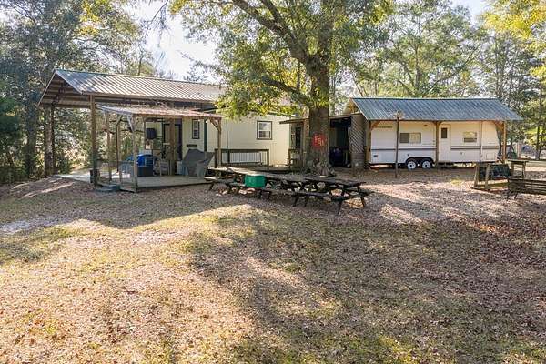 Discover this unique 18 acre recreational property in Geneva, AL. It is thoughtfully designed for relaxation, entertainment, and unforgettable gatherings. Private yet easily accessible, this versatile land has been enjoyed as a personal getaway & social retreat. At the center of the property is a cabin set beneath a pole barn w/ a concrete patio. The cabin includes a bathroom, kitchen, living/sleeping area & laundry, offering a comfortable base for extended stays. Outside the covered "picking porch" creates the ideal setting for evenings of music, laughter, and storytelling. Outdoor living is a highlight, featuring an outdoor kitchen with deck, hot and cold water, and a full-size refrigerator. Additional accommodations include a covered camper, an insulated shed that has been transformed into a bunk room w/ twin and bunk beds, and the "Turtle Overlook" w/ 3 bunk beds and air conditioning. The property is well-equipped for group gatherings with multiple RV hookups: (1) 50-amp, (3) 30-amp, and (6) 110-amp connections. Two pole barns & multiple covered storage structures provide ample space for equipment, wood storage & supplies. This property is ideal as a recreational retreat or a future homestead. Located a few minutes from in town Geneva, AL - approximately 10 miles from Hartford, Al - 25 / 30 miles from Enterprise & Ft Rucker, AL - 30 / 35 miles from Dothan, AL - 20 / 25 miles from Bonifay & Graceville, FL - 65 / 75 miles from Panama City Beach & Destin, Florida.