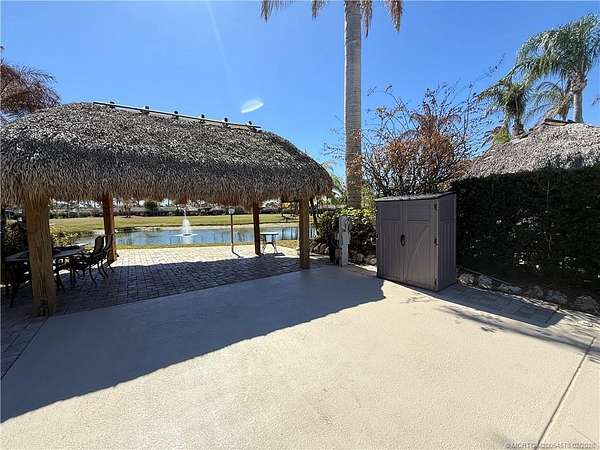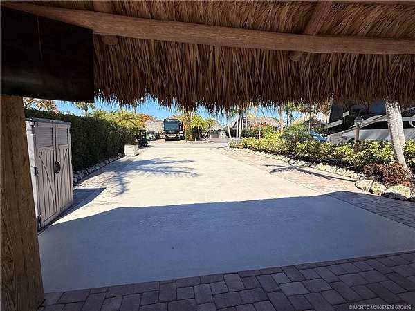 Nestled within an exclusive gated RV resort, this exceptional north-facing lot offers the perfect blend of privacy, tranquility, and upscale outdoor living. A spacious paver patio extends across the rear of the property, creating an inviting setting for relaxing or entertaining beneath a large, beautifully crafted tiki hut. Surrounded by mature trees and lush, established landscaping, the space feels serene and secluded while still capturing picturesque views. From the patio, enjoy a peaceful outlook of a softly illuminated water fountain and a charming wooden bridge that leads toward the golf green - a truly scenic backdrop both day and night. This premium lot provides an ideal orientation to keep outdoor spaces comfortably shaded, making it a perfect retreat for enjoying resort living at its finest.