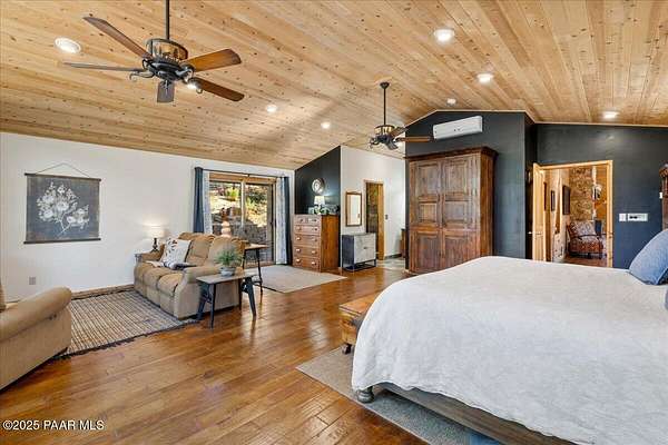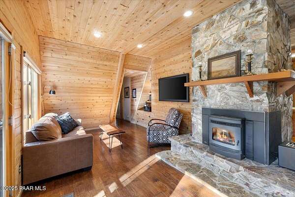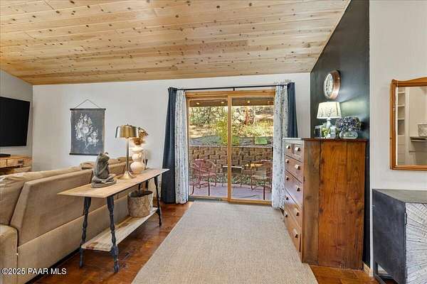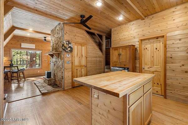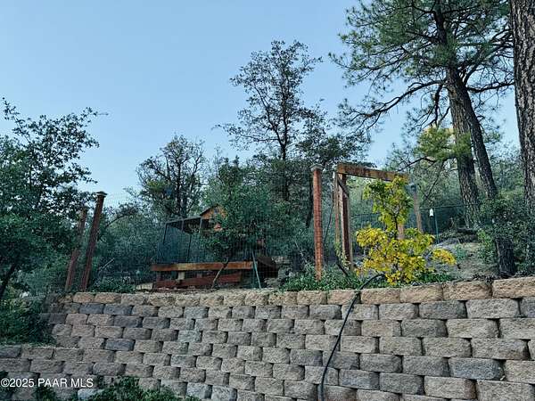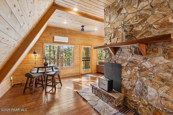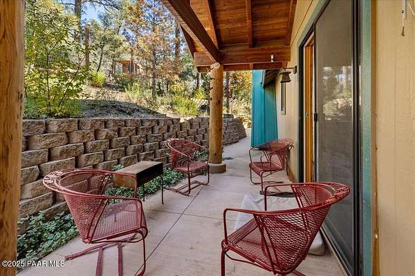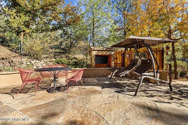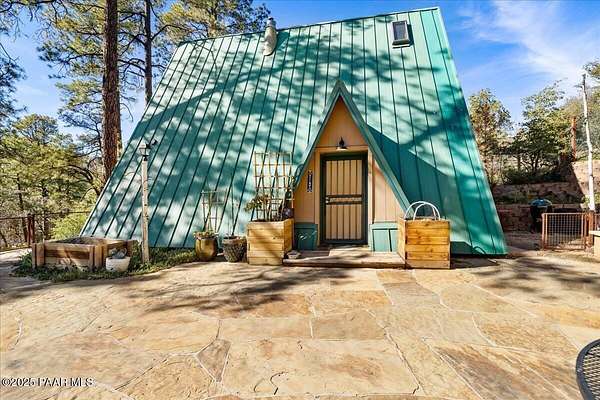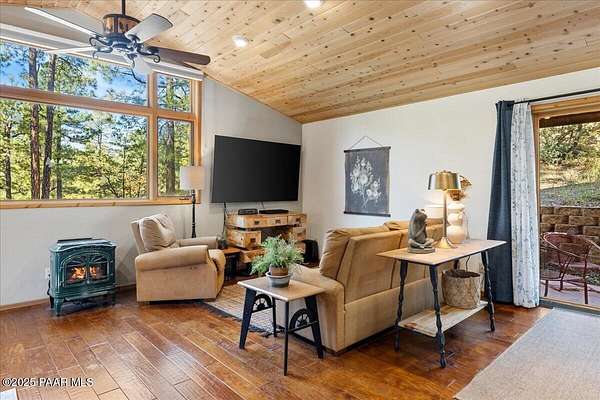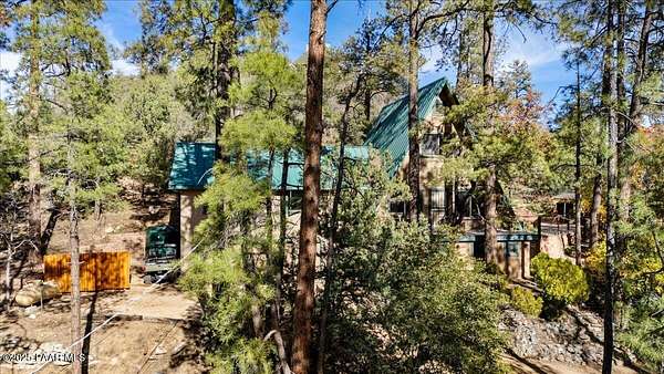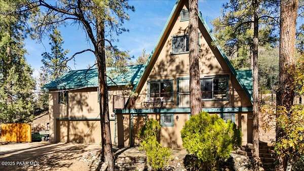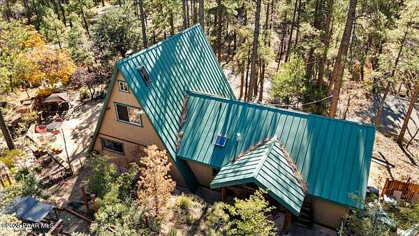 Nestled among the tall pines of desirable Dearing Park, this inviting modified A-frame home blends forest charm with a serene sense of escape--yet it sits just five paved miles from Thumb Butte. A fully fenced flagstone courtyard creates a peaceful outdoor living space ideal for birdwatching, relaxing, or enjoying cool mountain evenings, setting the tone for what awaits inside.Step through the door into a living room warmed by a high-efficiency pellet fireplace with a striking floor-to-ceiling rock surround. Expansive windows capture the surrounding trees and sweeping Prescott skies, filling the space with natural light and a constant connection to nature.The open kitchen combines rustic character with modern upgrades, featuring oak hardwood flooring, a butcher-block island, solid-surface counters, a commercial-style JennAir 4-burner gas range, and new appliances including the refrigerator and dishwasher. Nearby, a redesigned laundry closet offers enhanced convenience and functionality with a new stackable washer and dryer.The main-level primary suite provides a calming retreat, complete with an expansive sitting area and sliding glass doors that open to a private patio. The en-suite bathroom has been updated with fresh finishes that complement the home's mountain-modern style. Also on this level is a spacious full bathroom showcasing a classic claw-foot tub and a separate shower.Upstairs, two guest bedrooms offer flexible accommodations, including a charming sleeping loft perfect for kids, extra guests, or creative use. A remodeled half bath on this level adds thoughtful convenience.Throughout the home, additional upgrades include updated toilets and ductless heating/cooling units in every bedroom for personalized comfort, along with newer mini-splits that ensure effortless year-round climate control.Outdoors, the 1.66-acre property (including two homesites) provides exceptional privacy with perimeter fencing. A chicken coop lends homestead charm, while redwood exterior stairs enhance the cabin's rustic appeal. An RV parking area and a second prepped building pad further expand the property's long-term potential.Practical features include a durable metal roof, an oversized two-car garage, a separate workshop, a private well, and a 2,500-gallon water holding tank for added peace of mind.Blending modern enhancements with timeless cabin character and an unforgettable forest setting, this home is ideal for full-time living or a peaceful second-home getaway in the heart of the Prescott pines. See full list of improvements in documents tab.