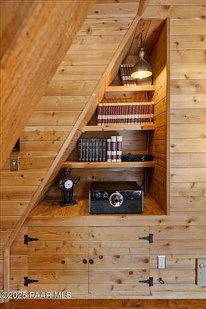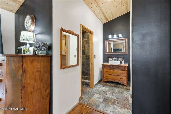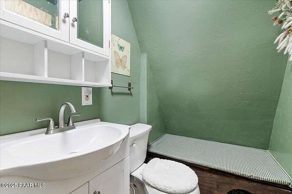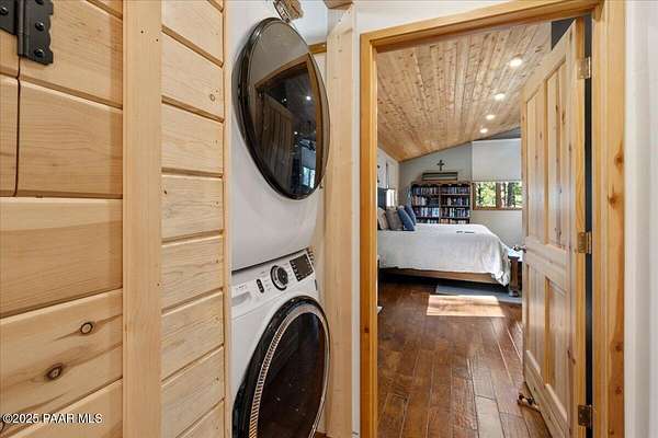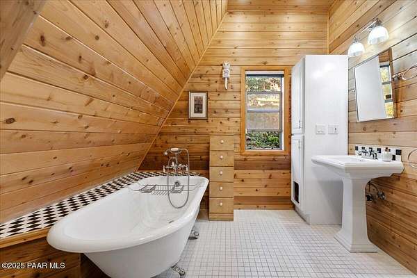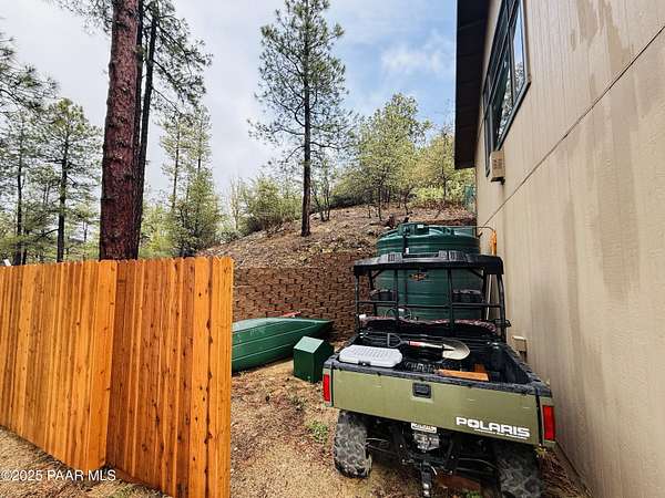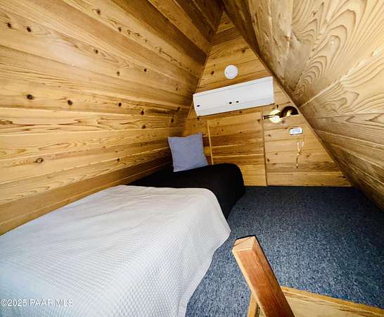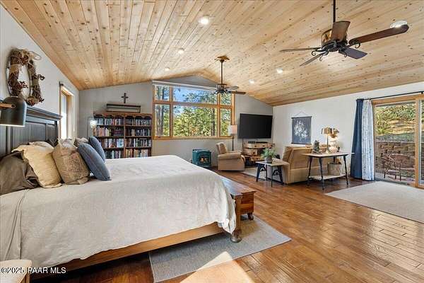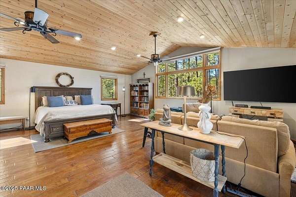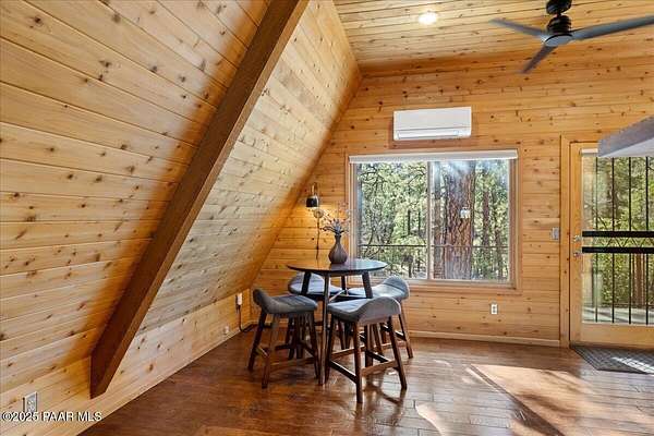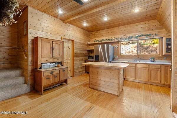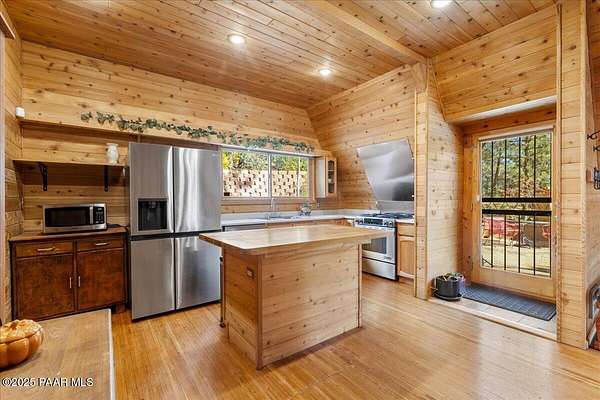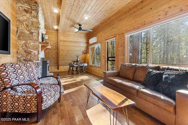 Nestled among the tall pines of desirable Dearing Park, this inviting modified A-frame home blends forest charm with a serene sense of escape--yet it sits just five paved miles from Thumb Butte. A fully fenced flagstone courtyard creates a peaceful outdoor living space ideal for birdwatching, relaxing, or enjoying cool mountain evenings, setting the tone for what awaits inside.Step through the door into a living room warmed by a high-efficiency pellet fireplace with a striking floor-to-ceiling rock surround. Expansive windows capture the surrounding trees and sweeping Prescott skies, filling the space with natural light and a constant connection to nature.The open kitchen combines rustic character with modern upgrades, featuring oak hardwood flooring, a butcher-block island, solid-surface counters, a commercial-style JennAir 4-burner gas range, and new appliances including the refrigerator and dishwasher. Nearby, a redesigned laundry closet offers enhanced convenience and functionality with a new stackable washer and dryer.The main-level primary suite provides a calming retreat, complete with an expansive sitting area and sliding glass doors that open to a private patio. The en-suite bathroom has been updated with fresh finishes that complement the home's mountain-modern style. Also on this level is a spacious full bathroom showcasing a classic claw-foot tub and a separate shower.Upstairs, two guest bedrooms offer flexible accommodations, including a charming sleeping loft perfect for kids, extra guests, or creative use. A remodeled half bath on this level adds thoughtful convenience.Throughout the home, additional upgrades include updated toilets and ductless heating/cooling units in every bedroom for personalized comfort, along with newer mini-splits that ensure effortless year-round climate control.Outdoors, the 1.66-acre property (including two homesites) provides exceptional privacy with perimeter fencing. A chicken coop lends homestead charm, while redwood exterior stairs enhance the cabin's rustic appeal. An RV parking area and a second prepped building pad further expand the property's long-term potential.Practical features include a durable metal roof, an oversized two-car garage, a separate workshop, a private well, and a 2,500-gallon water holding tank for added peace of mind.Blending modern enhancements with timeless cabin character and an unforgettable forest setting, this home is ideal for full-time living or a peaceful second-home getaway in the heart of the Prescott pines. See full list of improvements in documents tab.