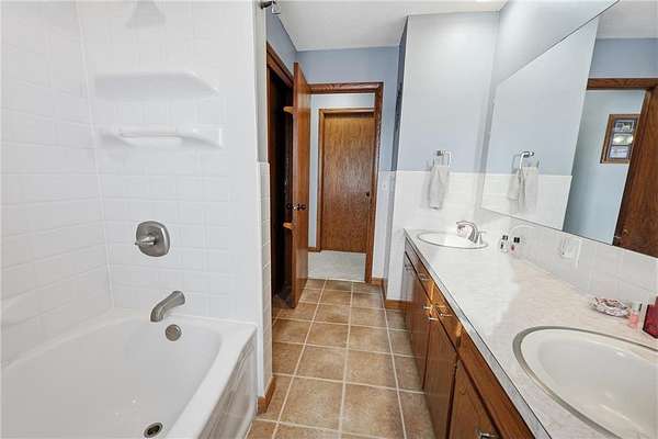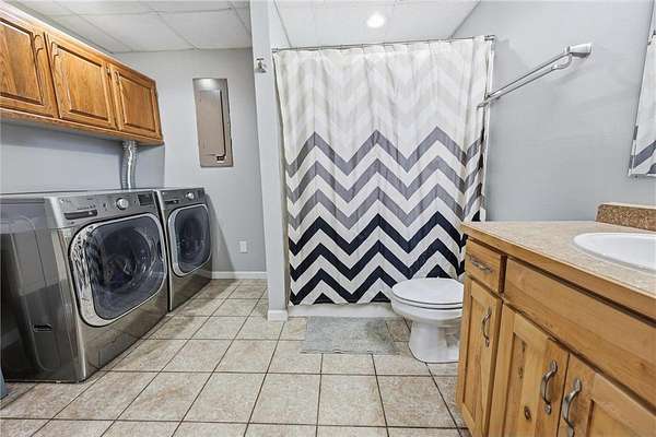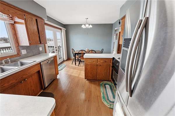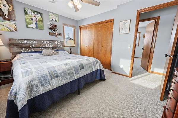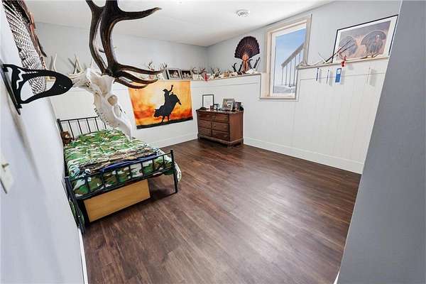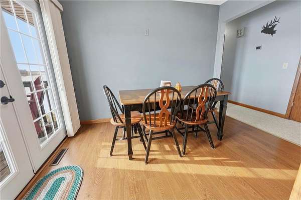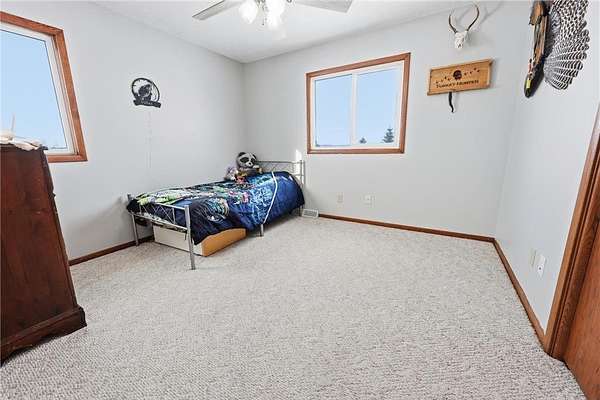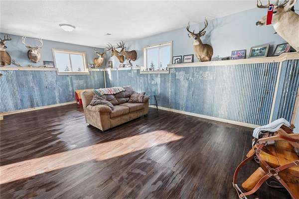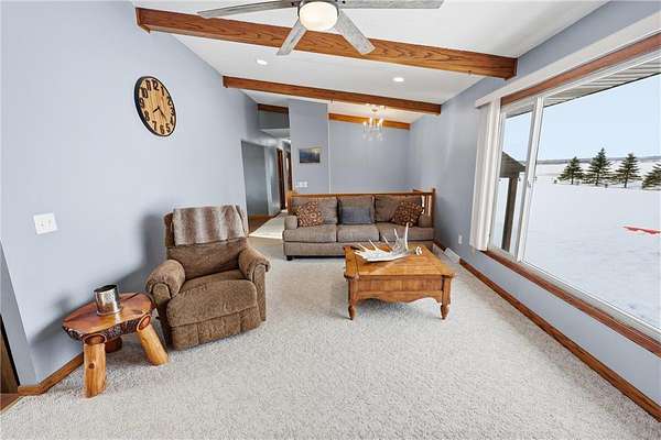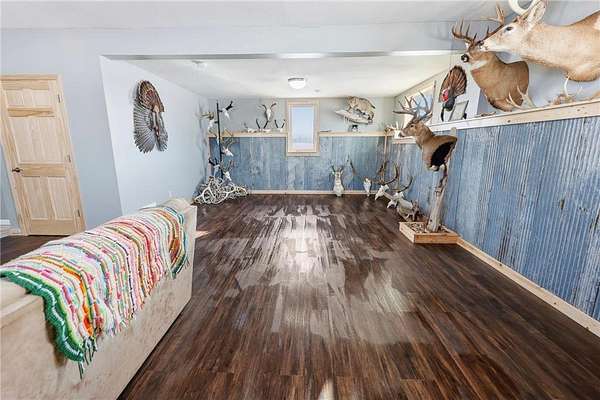 Spacious country home situated on just over 12 acres along a quiet rural road with no close neighbors. 5 bedroom, 2 bath home offers three bedrooms on the main level and two additional bedrooms in the finished lower level. The living room features vaulted, beamed ceilings, with windows that allow an abundance of natural light. The kitchen includes stainless steel appliances, a peninsula island open to the dining area that leads to the back deck overlooking the property. Updated vinyl windows, lower level flooring, trim work, and tile bathroom floors add modern comfort. The lower level offers a front-load washer and dryer along with board-and-batten accents and rustic galvanized tin wainscoting.