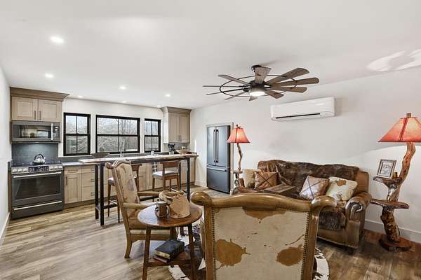 Nestled on the peaceful outskirts of the charming town of Landrum, this one-of-a-kind barndominium offers a rare blend of modern comfort, versatile space, and breathtaking views. Set on two level acres with two fenced pastures, the property borders a premier equestrian center. The main level features an expansive garage area with two garage doors and epoxy floors and the capacity to accommodate at least four vehicles, making it ideal for car collectors, hobbyists, or equestrian use. This level also includes a spa-inspired retreat with a luxurious steam room, sauna, and upscale tiled shower. You will also find a spacious walk-in laundry room and a convenient bathroom. Upstairs, the living space opens to an inviting office area, a comfortable bedroom with a spacious walk-in closet, and a full bathroom with a roomy standalone shower. The gourmet kitchen is beautifully appointed with granite countertops, new black stainless-steel appliances, and a custom-built, live-edge bar- the perfect spot to enjoy meals while taking in mountain views through the kitchen windows. Outdoor living shines with the covered back deck, complete with a wet bar and grilling area, where panoramic views stretch across fenced pastures to the mountains beyond. You'll also find everything you'll need to hookup your RV- always ready for your next adventure. The barndominium itself reflects a thoughtful balance of durability and charm, offering an adaptable living space well-suited for a full-time residence, a weekend retreat, or a creative live/work environment. With its proximity to Landrum's quaint downtown, local dining, and outdoor recreation, this property delivers rural tranquility without sacrificing convenience. Call today to schedule your private tour!
