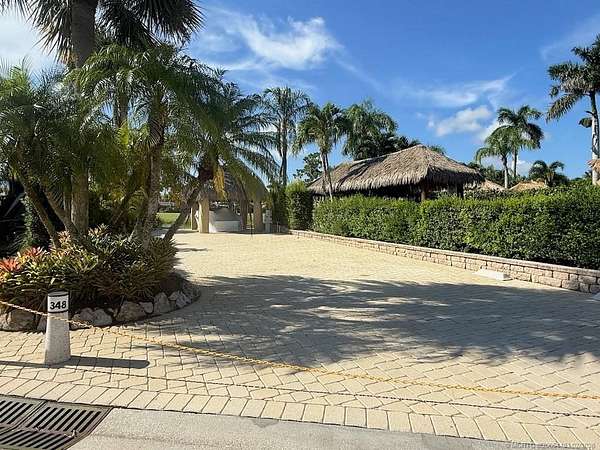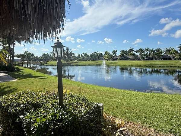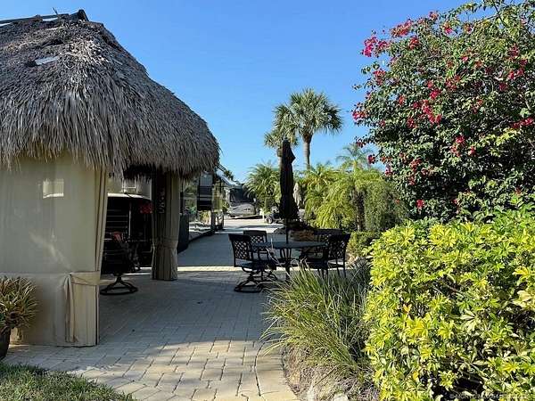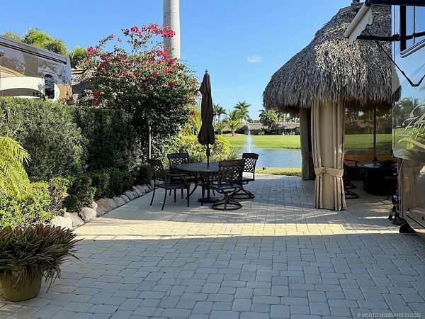 Stunning Waterfront Lot with Breathtaking Views - A MUST SEE! This fully pavered, meticulously maintained waterfront lot offers the perfect blend of luxury, privacy, and scenic beauty. Nestled in a prime location, it boasts unmatched views of the golf course, lake with its lighted fountain, serene waterfall, and charming wooden bridge leading to the 17th hole. The secluded tiki hut is designed for all-weather enjoyment, featuring screen curtains and and offering a private, comfortable seating area. Multiple seating and dining areas provide ample space for entertaining or relaxing in a tranquil setting. Mature landscaping, including several majestic palms and even a private pond, enhances the tropical ambiance. With its ideal north-facing orientation, you'll enjoy perfect sun exposure throughout the day. Move-in ready and truly one-of-a-kind, this waterfront gem is waiting for you! Don't miss this opportunity-schedule a tour today!