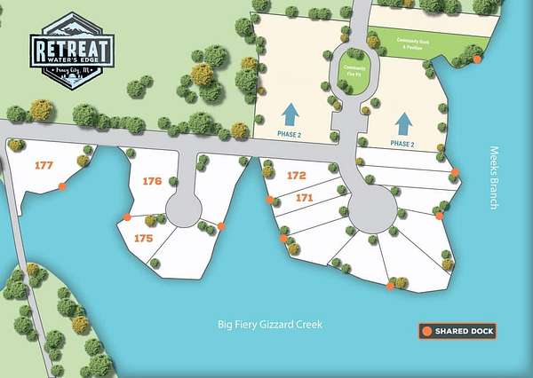 I-24 East to Exit 135. Turn LEFT onto Dixie Lee Ave. Bear RIGHT onto Fairmont--which becomes Highway 41. Go about 6 miles, turn LEFT onto Orchard Dr. Go 0.5, entrance to The Retreat Water's Edge is on the right. Lot 175 is the cove to the right.