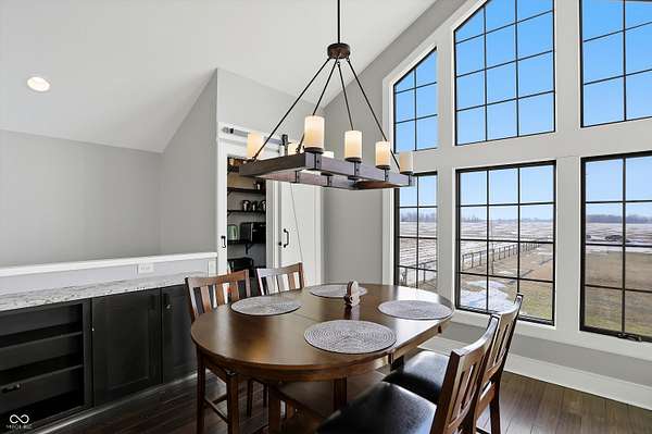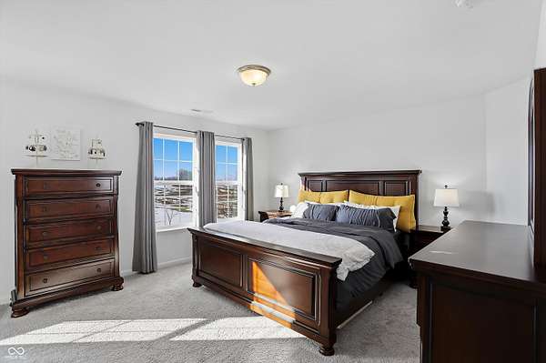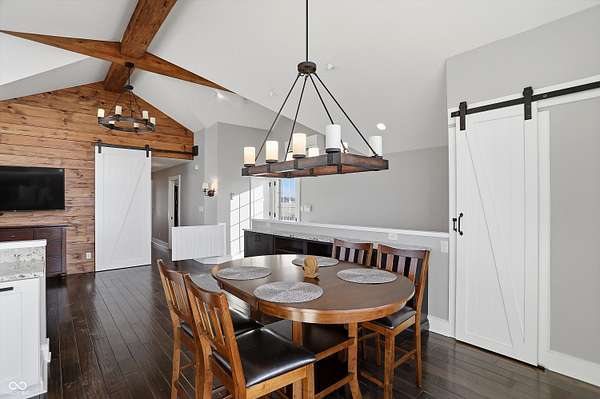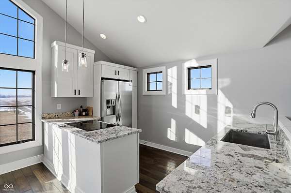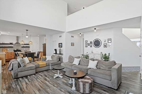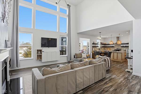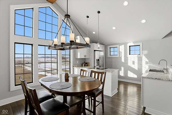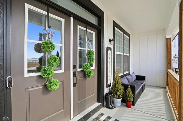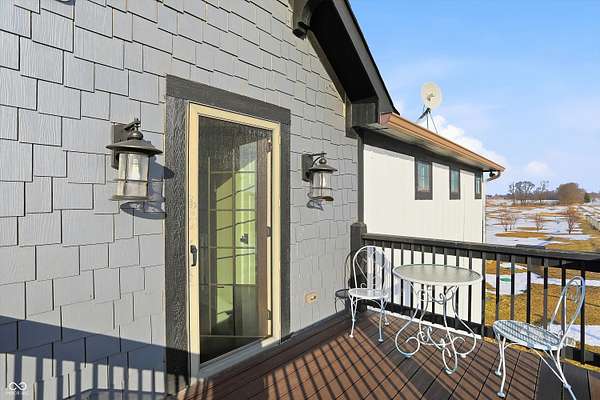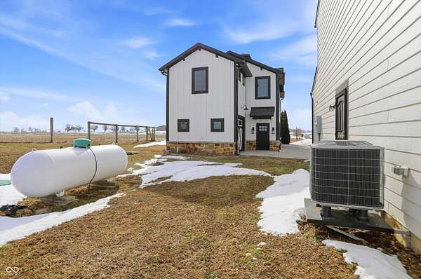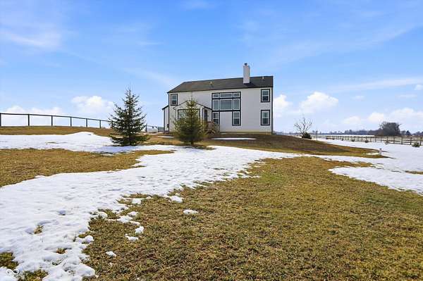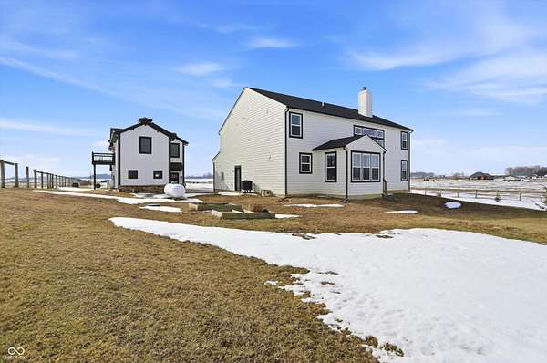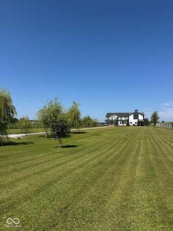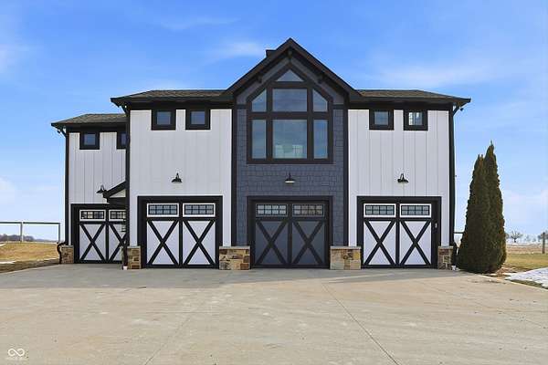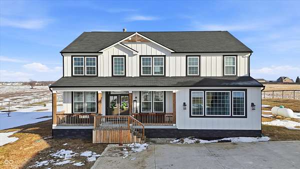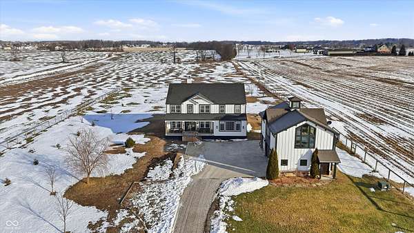 Situated on 28.5 acres in desirable Clark Township within Clark-Pleasant School Corporation, this exceptional property offers privacy, flexibility, and modern construction just minutes from Greenwood amenities, I-65, and I-74. The 2023-built main residence spans 3,560 sq ft and features a soaring two-story entry and cathedral ceiling in the living room, filling the home with natural light from an abundance of windows. The main level includes a formal dining room, sitting room, oversized office, sunroom, breakfast room, spacious kitchen with stainless steel appliances, generous pantry, ample storage, and a 20x20 exercise room with epoxy flooring that offers versatile use. A charming covered front porch welcomes you home. Upstairs, you'll find three bedrooms - all with walk-in closets - including a spacious primary suite with double vanities. The hall bath also features double vanities, and a large upstairs laundry room adds convenience. An expansive upper-level office/den provides additional flexible living space. LVP flooring runs throughout most of the home, with carpet in the bedrooms and select areas. The 2014 carriage house includes a three-car garage plus an additional partial stall with garage door. Above, the 1,104 sq ft apartment offers vaulted ceilings in the kitchen, dining, and living areas, two bedrooms with walk-in closets, one full bath, pantry, washer and dryer, stainless steel appliances, and a private balcony. Over 4 acres are fenced around the homes and include a storm cellar for added safety and peace of mind, while the remaining acreage is currently farmed with continued income potential or opportunity for gardens or orchard space. An interactive virtual tour is attached to fully explore both residences and the property layout.