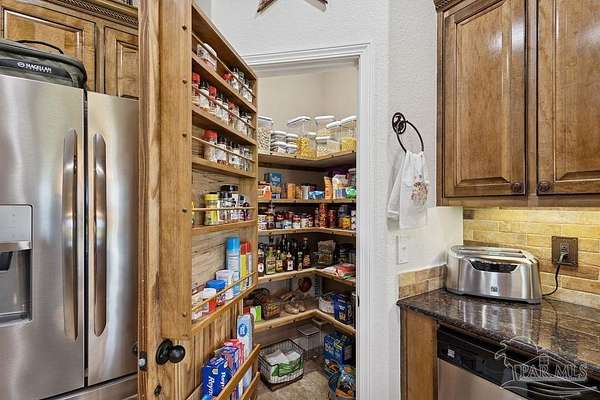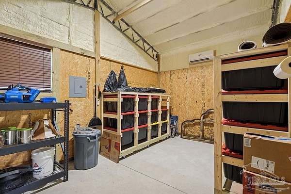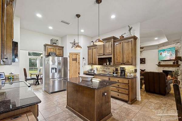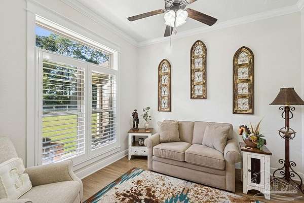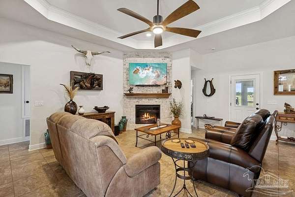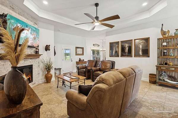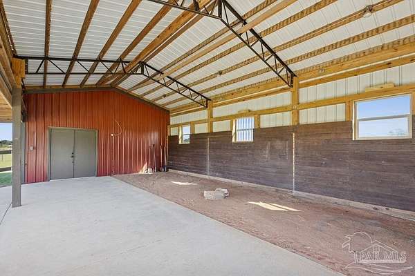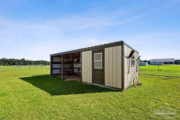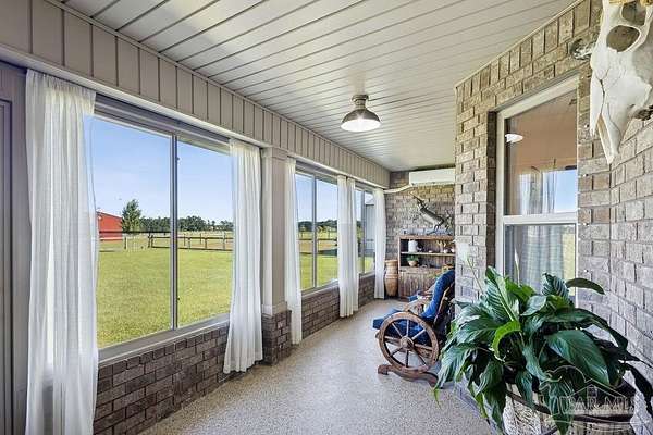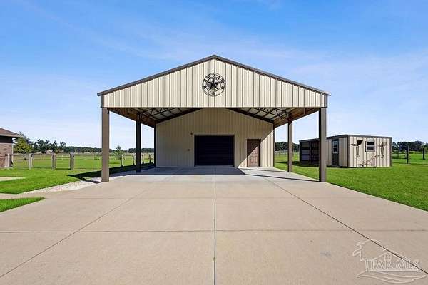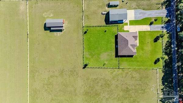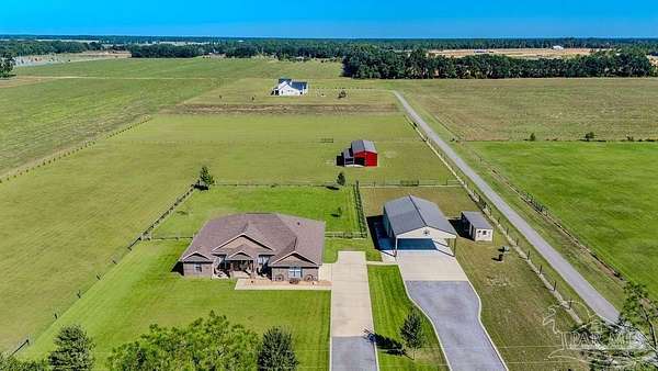 Beautiful all-brick custom home featuring 4 bedrooms and 3 full baths with a custom Florida room and two enclosed shops/barns on 5 fully fenced acres in Pace, Florida! Built in 2017, this property showcases high-end finishes inside and out with thoughtful upgrades throughout. Inside you'll find an open, split floor plan with tile flooring in main areas and LVP in the bedrooms and office. The home features plantation shutters across the front, a dining area with wood accent wall, chair railing and trimmed windows, and an electric brick fireplace that creates a warm focal point in the living room. The kitchen includes granite countertops, soft-close drawers, a spacious pantry, and tile backsplash. The hallway includes a full bath with a nearby bedroom and built-ins in the closet. Three-way split layout offers two additional bedrooms and full baths on the opposite side of the living area. The master suite includes custom built-ins, a large walk-in tile shower with glass enclosure, and a drop-in soaking tub. Additional features include a hard-wired security system, all-electric utilities, and an enclosed Florida room with mini-split for year-round comfort. Outside you'll find beautiful acreage and multiple functional outbuildings. The former horse barn (20x48) is insulated and equipped with power, water, and a mini-split A/C. The detached shop (30x24) includes power and water, plus an additional 30x24 covered carport for parking. Concrete work, gutters, and epoxy finishes were professionally completed by Ninja Coating. Property also includes irrigation, both well and city water access. This one checks every box-custom, turn-key, private, and ready to enjoy. Conveniently located just 5 minutes to Publix and 20 minutes to Pensacola-tucked away, yet close to town and amenities!