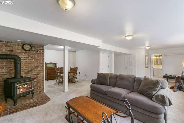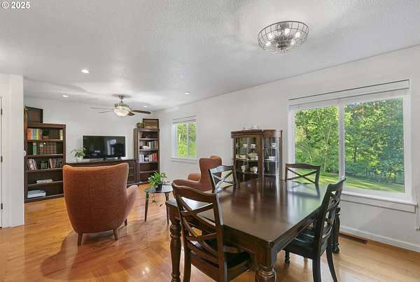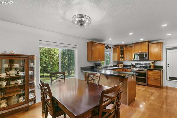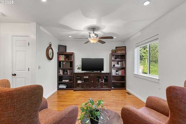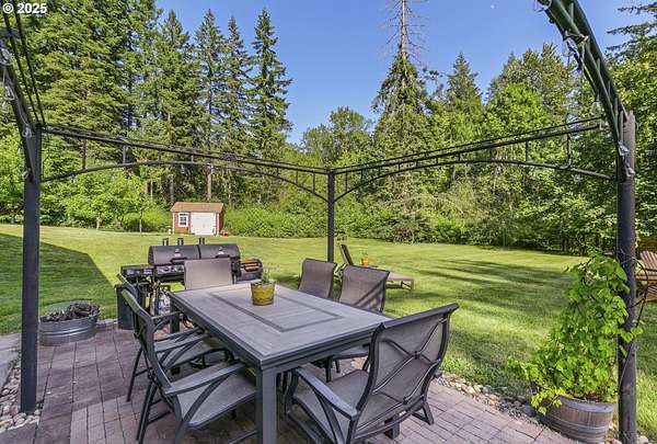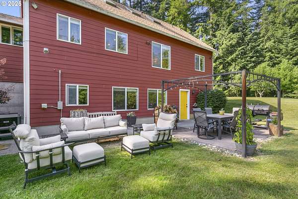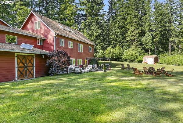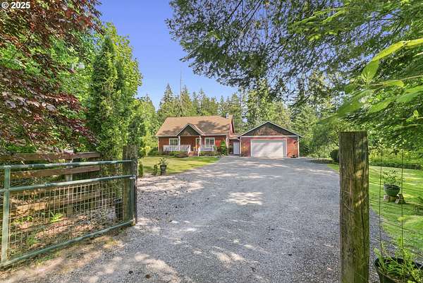 Private, gated 5 acres in La Center offering main-level living, multi-generational flexibility, and exceptional hobby space. The main floor features a formal living room, family room, spacious kitchen, and primary suite. Upstairs includes two bedrooms, a loft, and full bath. The daylight lower level offers a large great room, office/flex space, full bath, and separate entrance-ideal for guests, multi-gen living, or a home business. The property includes flat, fenced acreage with a year-round pond, walking trails, and firepit. An oversized workshop with lean-to provides space for RV/boat storage, vehicles, tools, or studio use, plus an additional storage shed. Gated entry with ample parking. Peaceful setting just minutes to I-5 with usable land for animals, gardens, and outdoor living.