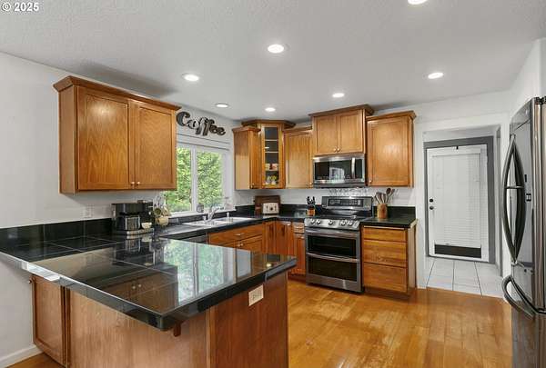 - Builtin Range, Dishwasher, Disposal, Double Oven, Free Standing Refrigerator, Island, Microwave, Pantry, Plumbed For Ice Maker, Stainless Steel Appliance, Tile