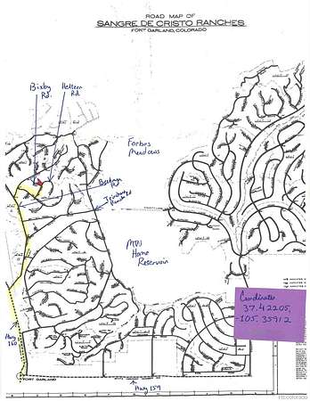 Travel east from Ft Garland on Hwy 160m turn right on Trinchera Ranch Rd, left on Beekman, right on Slaughter, right on Heltzer, left on the corner of Bixby and Heltzer. Coordinates:337.42205,-105.35912