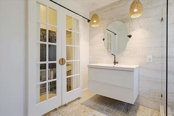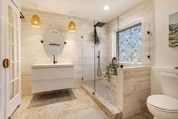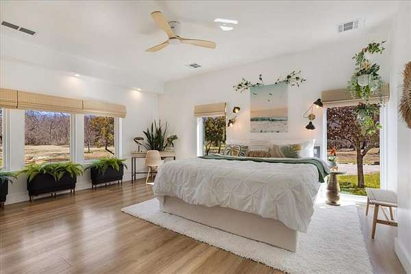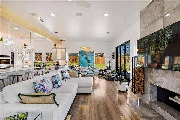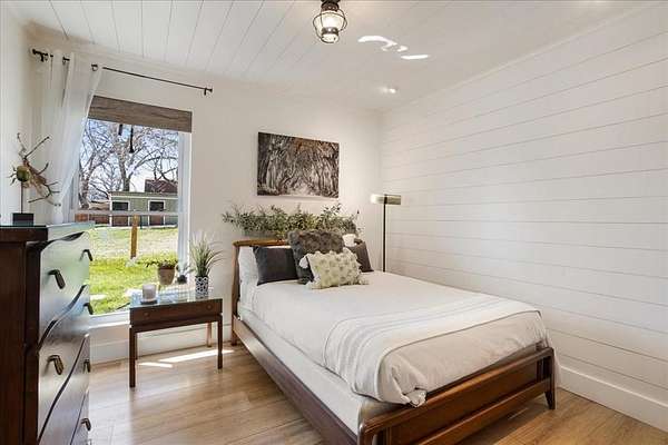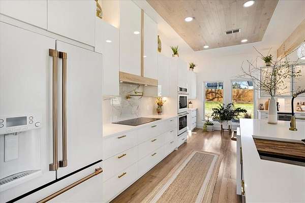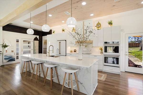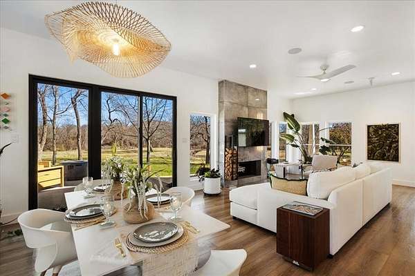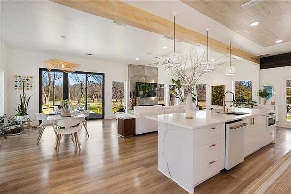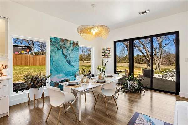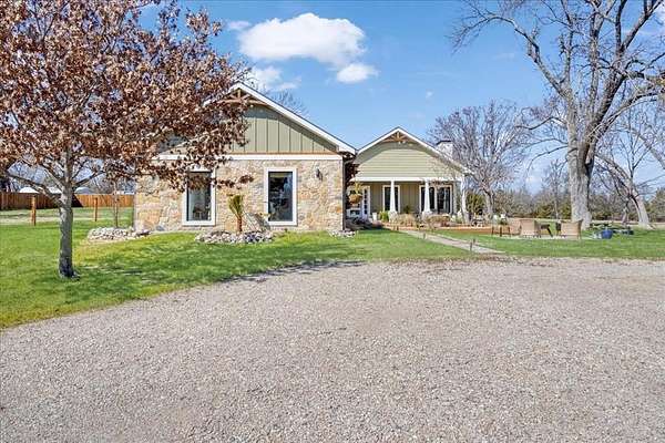 Meticulously redesigned, this modern architectural residence offers a rare blend of refined design, functionality, and privacy in Wylie, Texas, just minutes from Lake Ray Hubbard. From the moment you enter, the home establishes a distinct presence. A handcrafted oak wrapped beam, custom floating entry cabinet, and curated architectural accents create a warm yet elevated introduction. The open concept great room is anchored by a concrete inspired wood burning fireplace, while expansive windows frame the natural surroundings and draw in consistent natural light. The kitchen has been thoughtfully designed for both daily living and entertaining. A 14 foot quartz island with waterfall edge serves as the focal point, complemented by European style cabinetry, marble accents, and GE Café appliances with brushed copper hardware, including an induction cooktop and double convection ovens. Subtle ceiling inlay work and ambient lighting further enhance the space. The layout is both functional and flexible, offering a private guest suite with ensuite bath, two additional bedrooms with distinct character, and a well appointed hall bath. The laundry room continues the design narrative with custom storage, a butcher block folding station, and elevated finishes. The primary suite is positioned to capture the setting, with walls of glass overlooking a creekside backdrop. A linear fireplace adds warmth, while the ensuite bath features dual rain shower heads, double vanities, and a custom walk in closet, creating a true retreat. 8 foot sliding glass door provides seamless indoor outdoor flow, opening to a private setting designed for both relaxation and entertaining. The property is located approximately 3 miles from a public boat ramp for Lake Ray Hubbard, offering convenient access to the water while maintaining privacy.