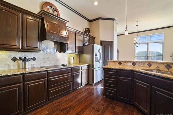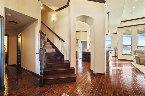 Step inside and you're immediately greeted by warm, rich engineered hardwood flooring that flows seamlessly throughout the main living areas, creating a sense of continuity and elevated craftsmanship. The flooring not only adds timeless beauty and depth to the space, but also offers durability and easy maintenance--perfect for both everyday living and entertaining. Its natural wood tones pair effortlessly with the home's Craftsman-style stone accents, detailed crown molding, and thoughtfully selected finishes, giving the interior a cohesive, upscale feel.