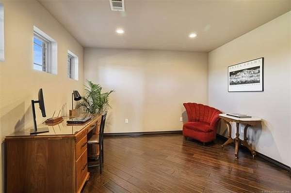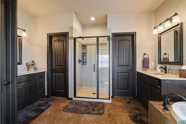 The open and inviting layout showcases granite countertops, custom cabinetry, and refined architectural details at every turn. A dedicated office provides a quiet and functional workspace, while the living areas are designed to feel both comfortable and sophisticated. The primary suite is a true retreat, featuring a custom double vanity, spacious his-and-her closets, and a relaxing atmosphere that reflects the meticulous care given to this home.