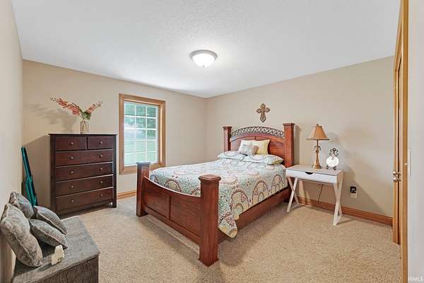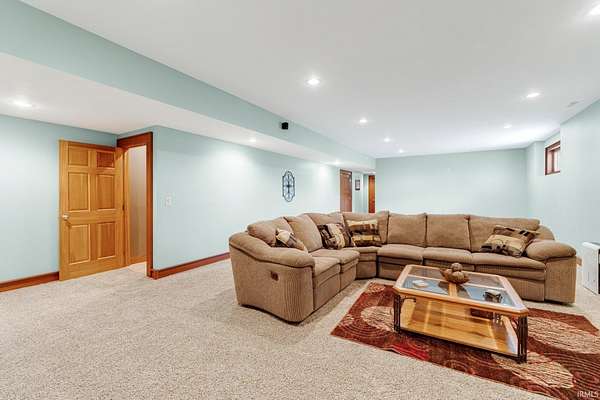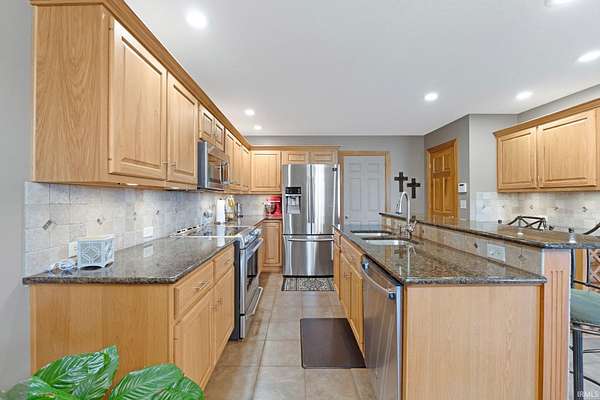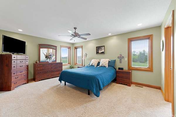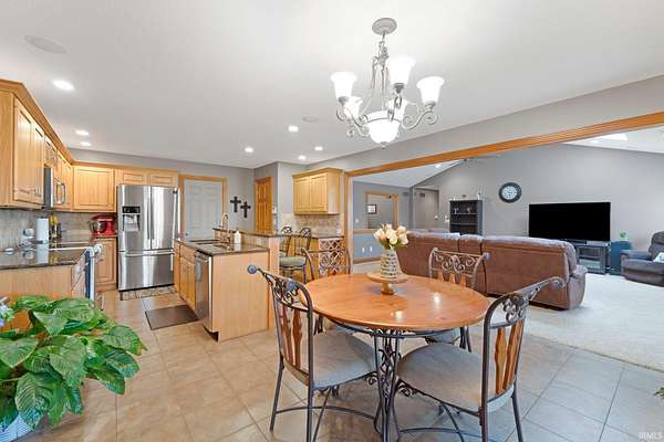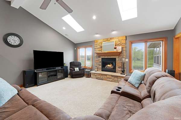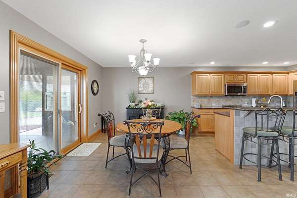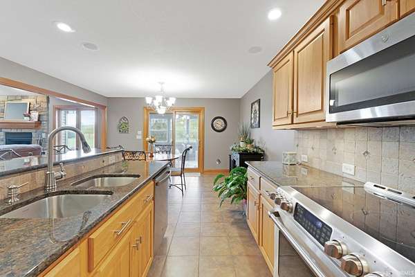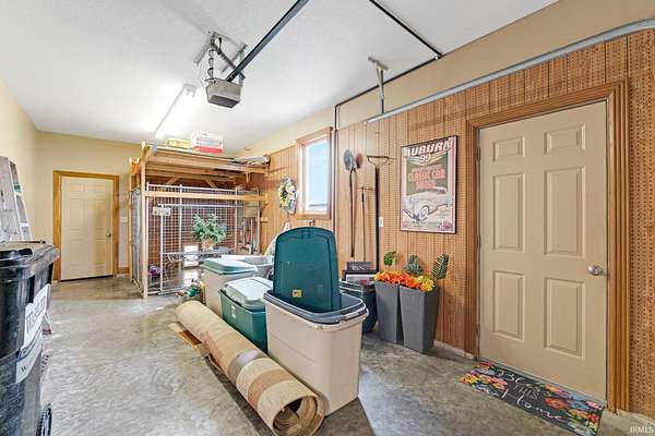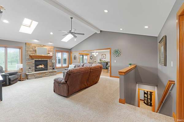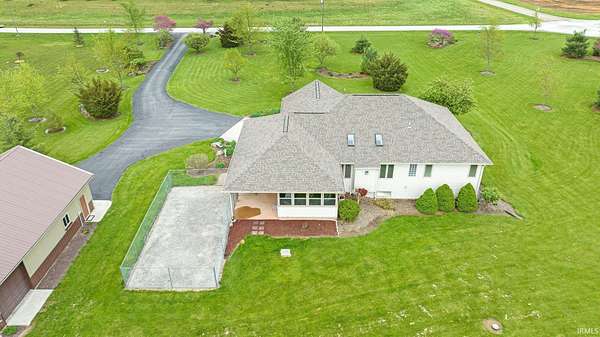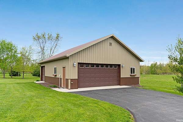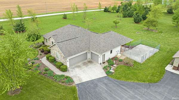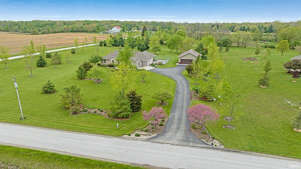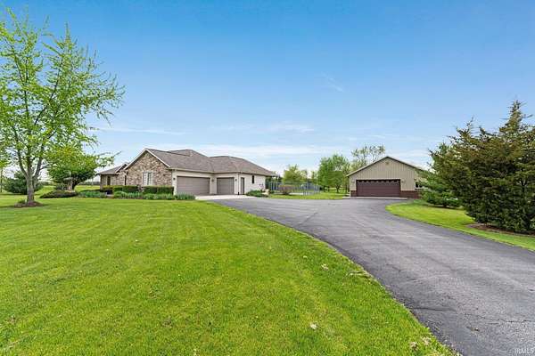 Custom-built in 2004, this 3-bedroom, 2-bath home sits on nearly 5 acres of beautifully landscaped grounds with a finished daylight basement offering a rec room and two additional rooms with walk-in closets--perfect for a home office or exercise space. The basement is also pre-plumbed for a third full bath. A 3-car heated garage with built-in cabinets and pegboard provides excellent organization, while the 32x42 pole barn (built in 2014) is ideal for storage or hobbies. Interior highlights include a remodeled kitchen (2010) with granite countertops, Grabill cabinetry, prep island with raised bar seating, travertine tile backsplash, and included appliances (Refrigerator, Dishwasher, and Microwave replaced in 2017). Additional features include a stone fireplace, paneled stained doors, walk-in closets, new basement carpet (2014), and a whole-house generator. Exterior upgrades include a new roof (2018), asphalt driveway (2014), and new porch windows (2018). Pet owners will appreciate the heated indoor dog kennel with access to a fenced run. Combining modern updates, functional amenities, and a peaceful park-like setting, this exceptional property is located just 2 miles east of DeKalb Middle and High Schools.